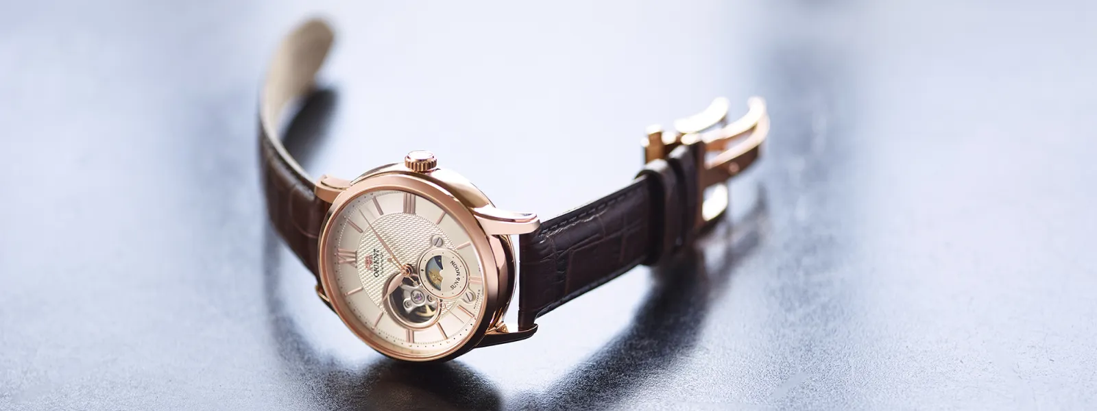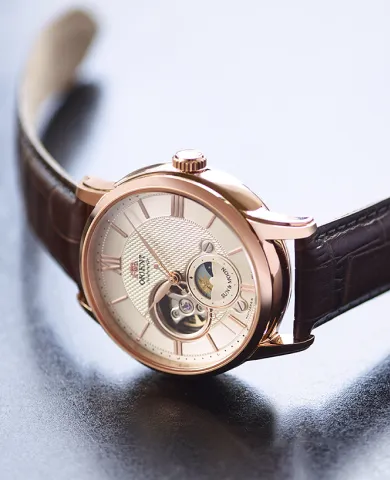 A sun and moon appear in the small window on the dial to trace the passage of time and indicate day or night.
