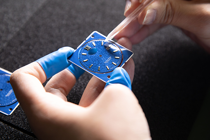 The technique is characterised by the way in which it controls the appearance of light, so to speak, by applying multiple layers of nearly transparent films so that only the blue wavelength is reflected, resulting in a blue dial. Epson’s development team explains that “rather than mixing colours as in paint or display coloration, this technique makes what is essentially transparent water appear blue in the ocean, or emerald in a volcanic lake.”