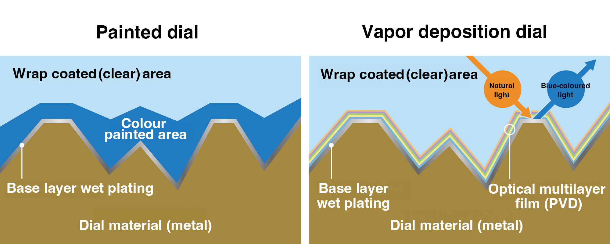 The optical multilayer film technology developed by Epson takes advantage of this colour vision mechanism. Epson had consistently acknowledged the issue that dark or deep-coloured coating on the patterned dials would make the intricate patterns difficult to recognise. In the process of solving this problem, the company focused on optical multilayer film technology, which is considerably thinner than painting.