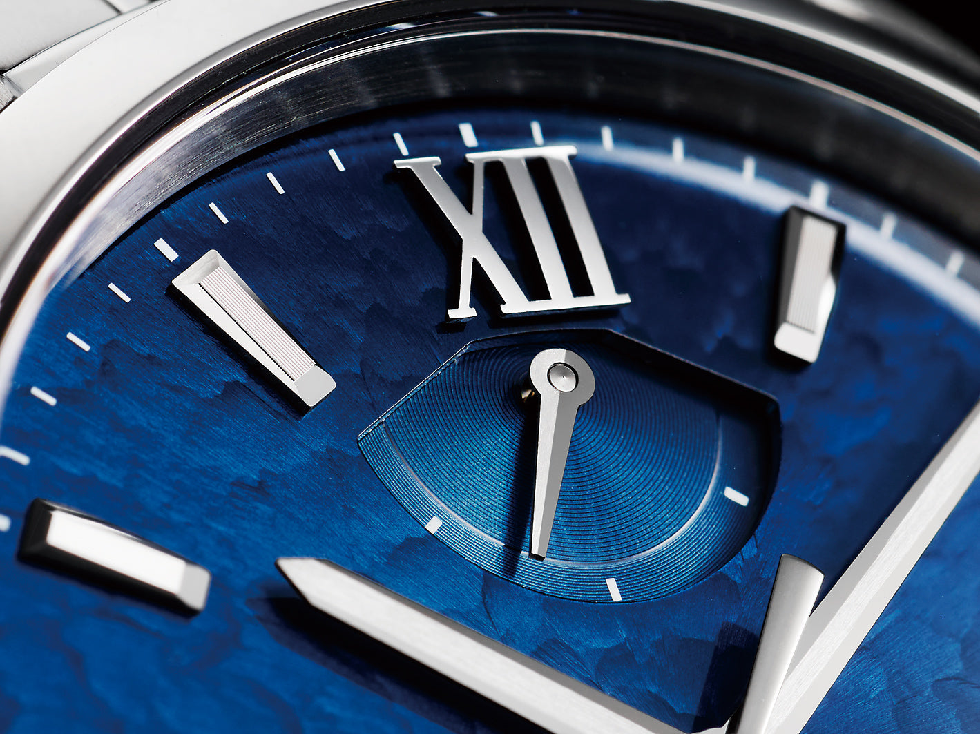 As for the production process, first, a brass plate is pressed into a die with intricate patterns engraved by artisans to create the dial. Then, the base layer is wet-plated, and multiple layers of nano-level thin films are built up by vapor deposition. To create the intended colour tone, it took several years to determine the combination of the films as well as fine-tuning the thickness of each film, to achieve the blue colour with a sense of depth that Orient Star desired as exhibited in this timepiece.