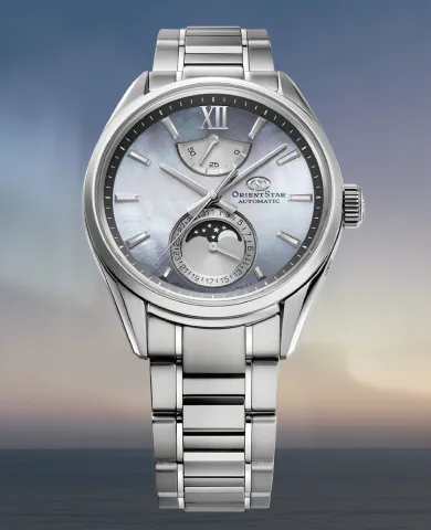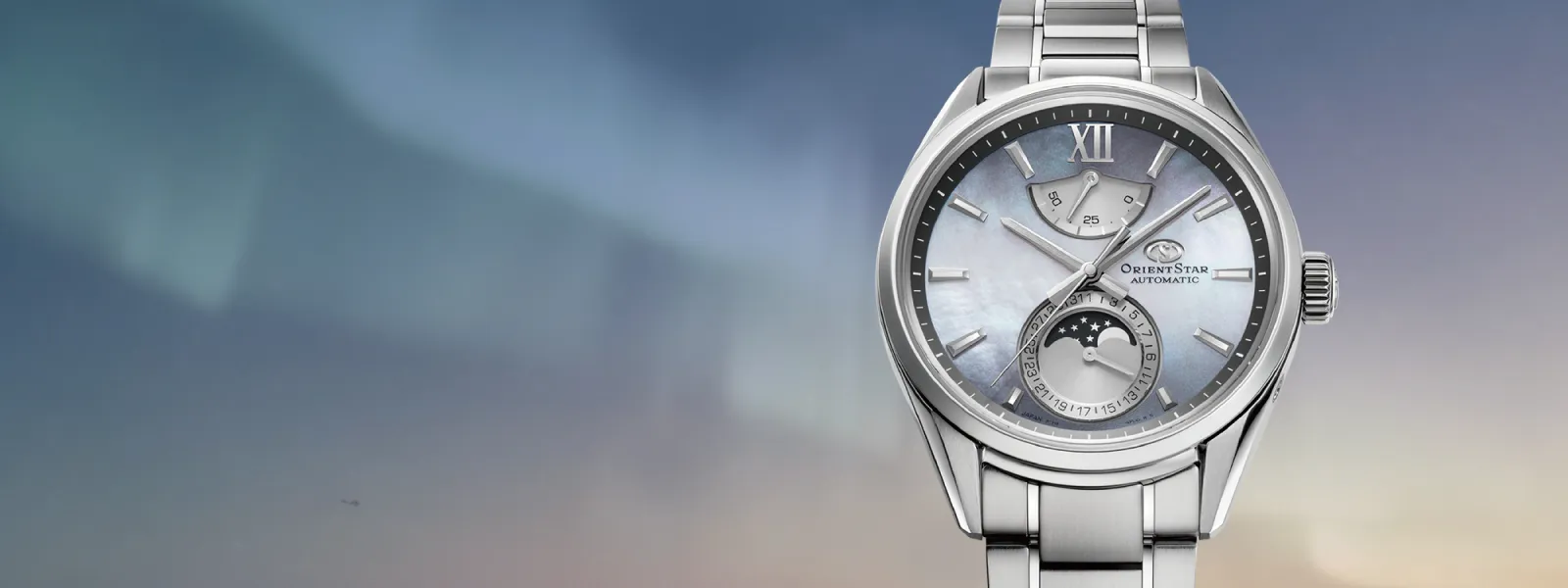 The dial captures a curtain of light before dawn, where aurora-like hues and a moon phase shift with time.