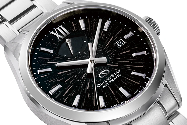 Hands and index, meticulously finished with contrasting hairline and mirror surfaces, along with the diamond‑cut frame of the calendar window, introduce sharp, shimmering accents against the deep black background. Together with the motif of a meteor shower, these refined details infuse the dial with a sense of dynamic movement and vivid energy.