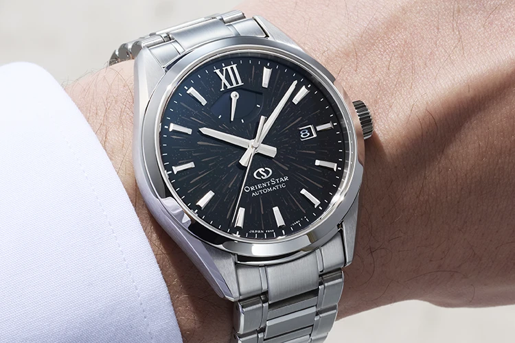 Created using "Nanoparticle Metal Layering Technology", the dial captures the beauty of a meteor‑lit night sky. Its expression shifts with light, recalling the fleeting brilliance of the Perseid meteor shower. A subtle gradation deepening toward the perimeter, enhanced by a clear coating, evokes the profound depth of outer space.