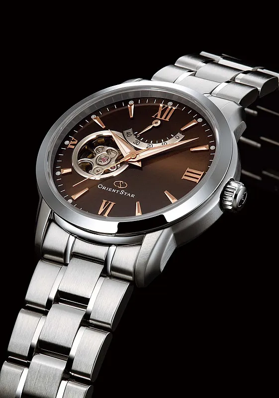 機能面ではこれまでと同様、パワーリザーブインジケーター表示、手巻き機能と秒針停止機能を備えています。ケースは、スーツスタイルにも合わせやすいシンプルなケースを採用し、さまざまなシーンで活躍します。ラグの斜面は、彫刻刀で削り取ったような特徴のある造形(OSカット)で、高品質、高機能な機械式時計のオリエントスターシリーズの中でも、上位モデルに共通したデザインです。ダイヤルとインデックスは、光沢感のある放射目のダイヤルに9時位置のセミスケルトンのムーブメントが印象的なデザインで、シースルーバックとともに時計内部のムーブメントの動きを表裏両面から見ることができ、こだわりのある男心をくすぐります。さらに、フラットサファイアガラスを採用し、視認性と強度を高めました。バンドには、シンプルで馴染みのよい3列駒の無垢メタルバンドを使用しています。