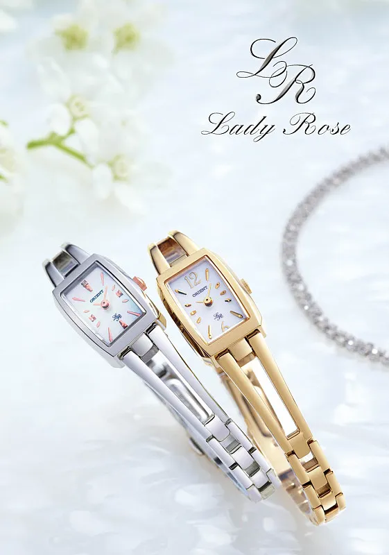 「オリエント・レディーローズ」は、上品で洗練されたコンテンポラリーなジュエリーウォッチです。商品ラインナップの全シリーズに、肌に美しく映えるピンクゴールド色をキーカラーとして採り入れています。華やかで繊細なデザインは、ジュエリーとの相性が良く、その日の気分に合わせてコーディネートをお楽しみいただけます。またジュエリーウォッチの特徴を備えながらも、視認性や使いやすさにもこだわっています。