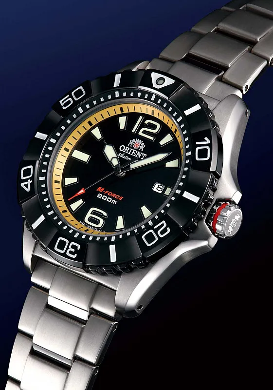 このたび発売する『オリエント M-FORCE(エムフォース) 200m チタンモデル』は、これまでのJIS規格のスキューバ潜水用200m防水機能や特殊構造による衝撃吸収性に加えて、ケースとバンドにチタンを使用して軽さと強さを兼ね備えた、本格的ダイバーモデルです。