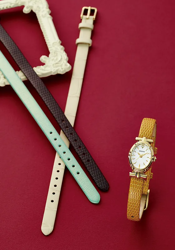 このたび新たに発売する『ORIENT Neo70'sクラシックレザー オーバル』は、ファッションや気分に合わせて自由にバンドを変えることができる、クラシックテイストのレディースウォッチです。付け替えのしやすい引き通しタイプのベルトは、定番人気のトカゲ柄2色に、ちょっぴり大人の雰囲気を演出できるワニ柄、パステルトーンのカーフを加えた4種類をご用意しております。