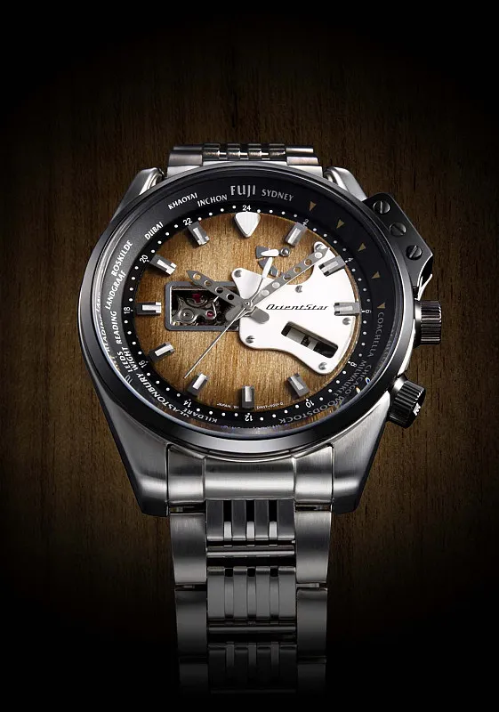 今回の『オリエントスターレトロフューチャー ギターモデル NEWカラー』では、1950年代のエレクトリックギターのイメージを忠実に再現するため50年代のギターのボディに多く使われていた天然木(アルダー)を素材に使用しております。デザイン面では上下アシンメトリーのケース足は、ギターデザインの核ともいえるボディ形状に仕上げました。また、2時位置のりゅうずガードはギターヘッドを、りゅうずはトーン・ボリュームのコントロールノブを想起させます。さらに、ダイヤルの右位置にピックガード形状の模様、12時位置にピックをイメージさせるインデックスを配するなど、ギターのあらゆるパーツをケース裏や側面も含め、隅々まで散りばめ、ギターを愛する方にピッタリなモデルとなっております。