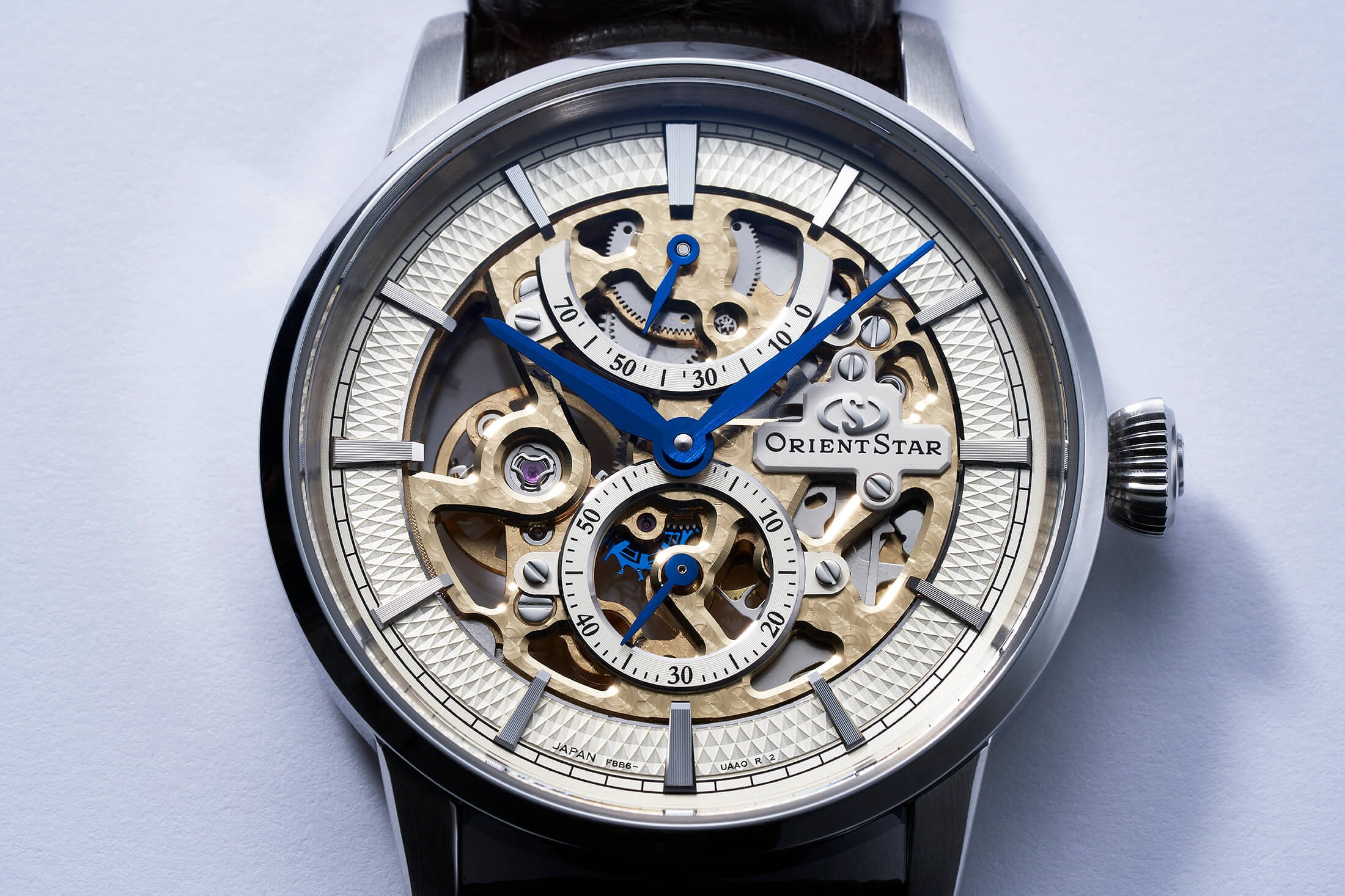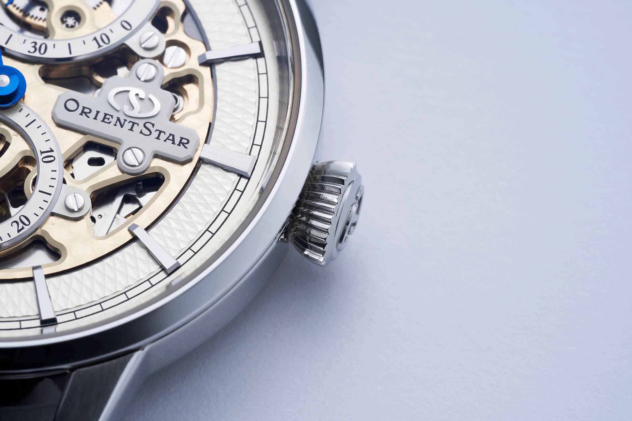 シリコン製ガンギ車は、まずオリエントスターを象徴する“スケルトン”に用いられた。元来、センターセコンドである46系をスモールセコンド化するため、小秒針が付く秒カナを4番車で回す特殊な設計を採用。結果、インダイヤル内にブルーのシリコン製ガンギ車が動く様子が見せられる。