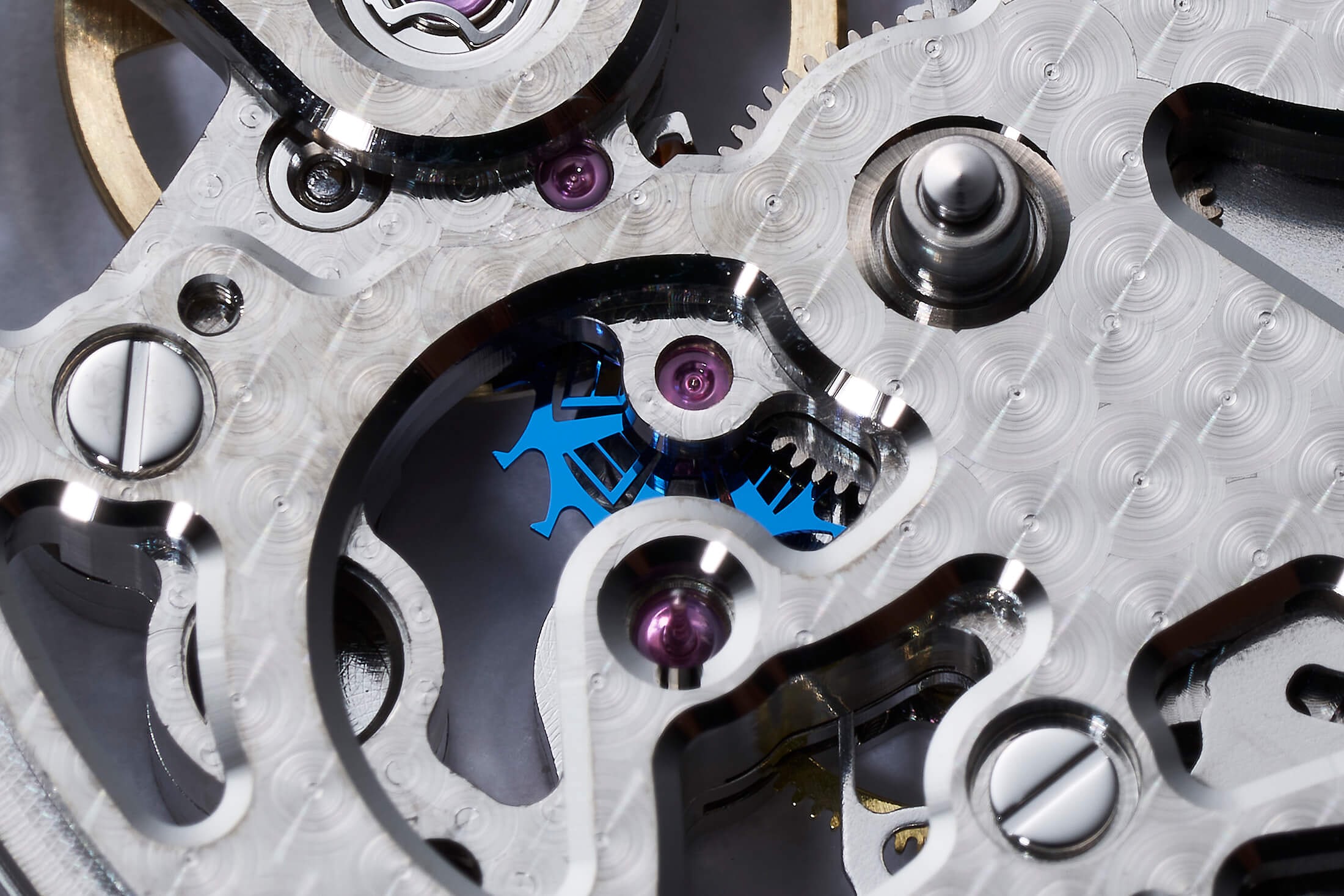 シリコン製ガンギ車の製造には、スイスの時計メーカー各社が用いるシリコン製パーツとはまた異なる、半導体やプリンターヘッドの製造で培った技術が駆使されている。その表面は、半導体成膜技術によってナノメートル単位で膜厚調整した酸化膜とアモルファス(非結晶)構造をもつポリシリコンの多層膜構造を形成。これにより、鮮やかで美しいブルーのカラーリングを得ている。