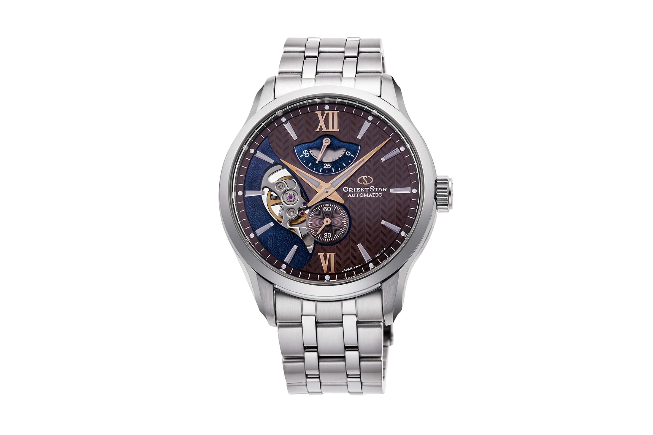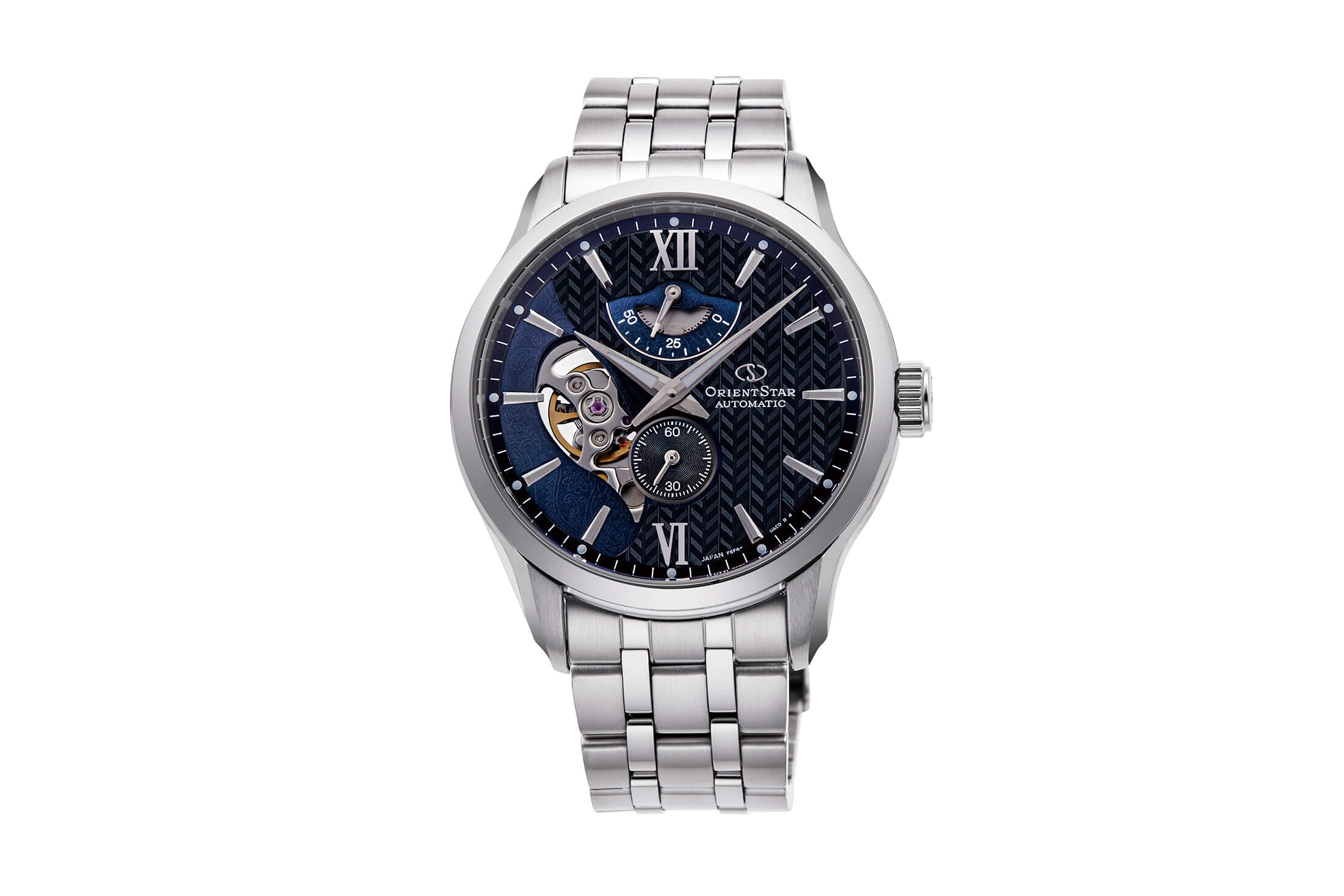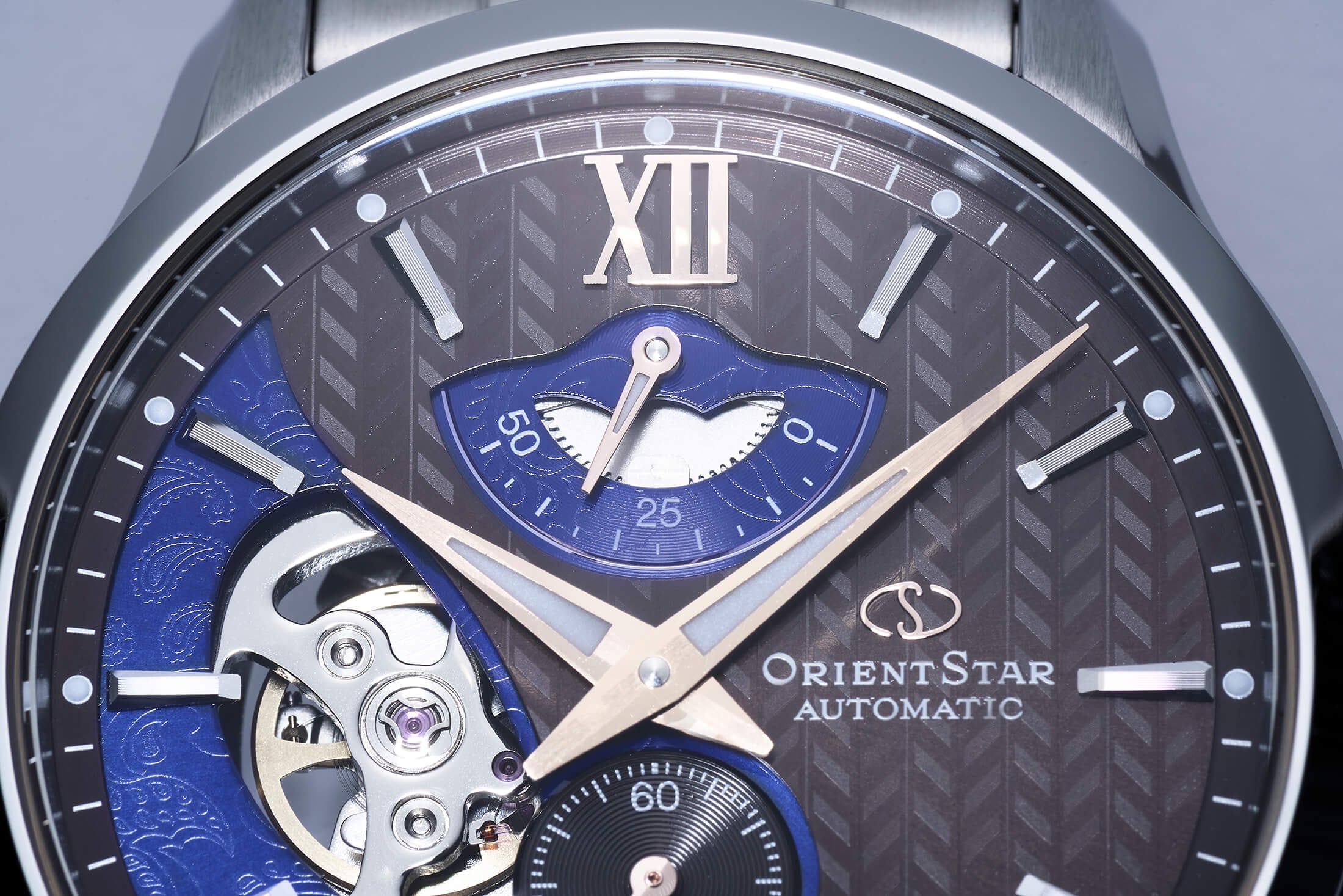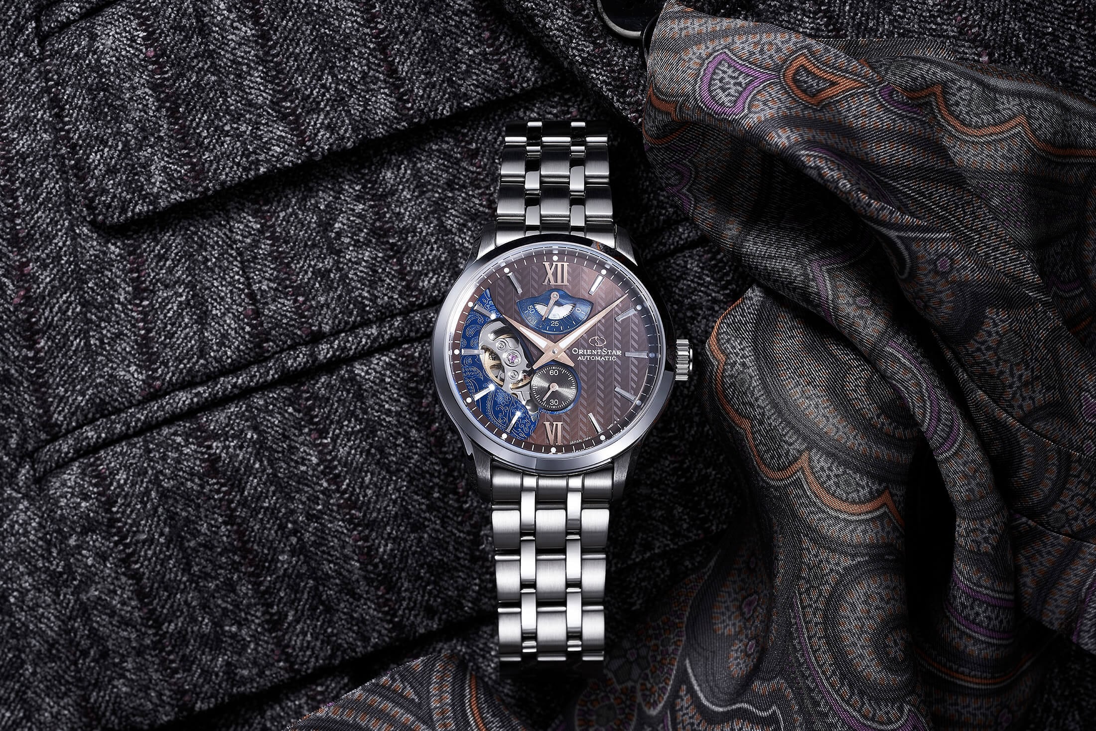 レイヤードスケルトンでは、実に斬新なデザインが与えられた。その名のとおり、ダイヤルは有機的なカーブで切り分けられた2層のレイヤード構造。各層はスーツのテキスタイルをモチーフとし、上層にはヘリンボーン柄を、下層にはペイズリー柄を転写で表現したのである。さらに下層部は、テンプの動きを見せるハーフスケルトンに。その開口部が模様と同じペイズリーシェイプをしているのがユニークなところで、こうした遊び心は“デザインのオリエントスター”らしい。