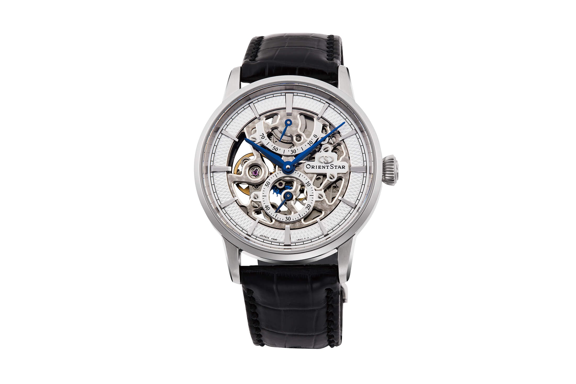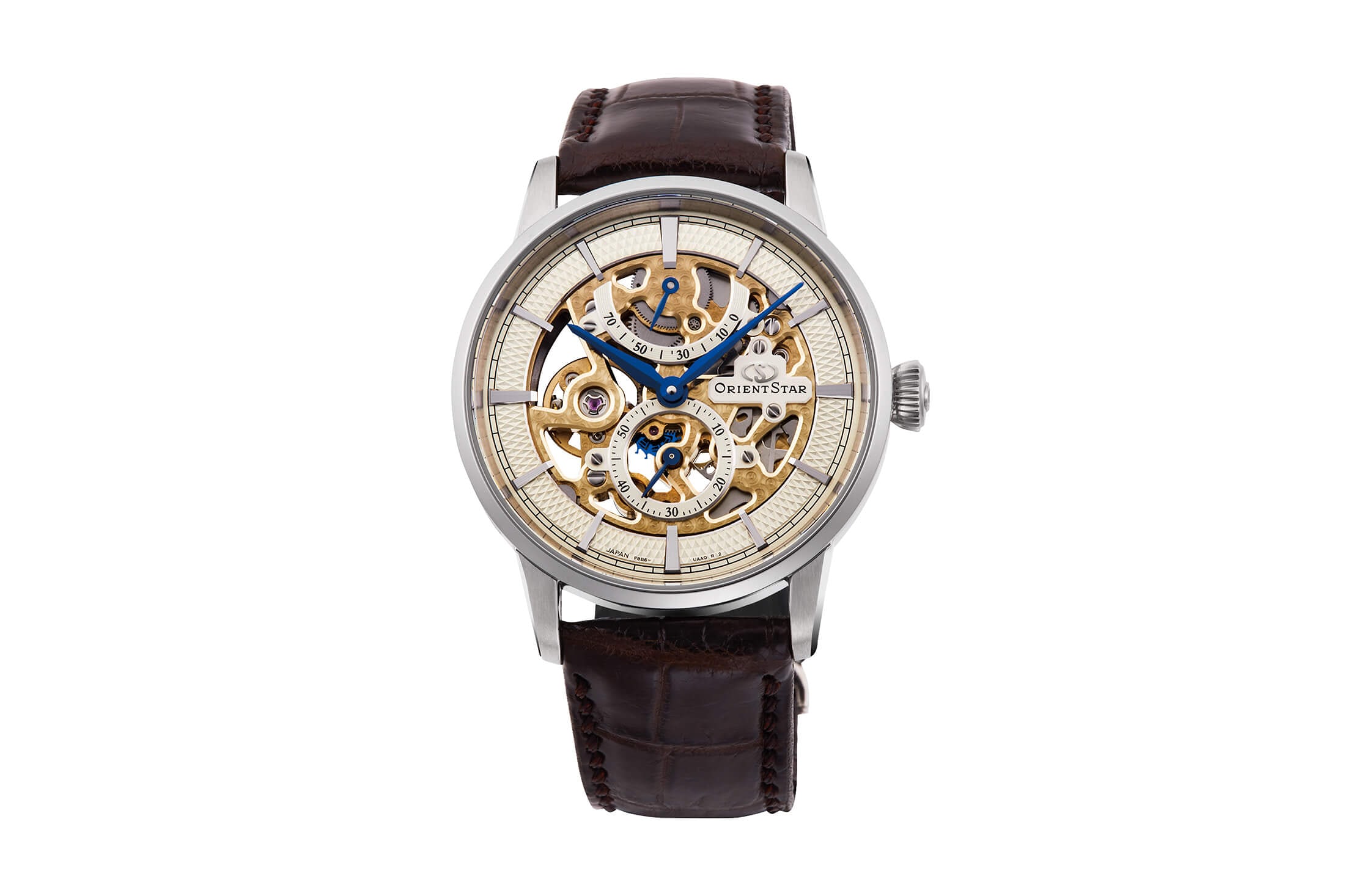 1970年代に入り、国内向けの生産をクォーツに軸足を移したことで、一時は姿を消していた機械式のオリエントスターだったが、1990年代に入り復活を果たす。搭載したのは、1971年に誕生した基幹ムーブメント、機械式の46系。これをベースにオリエントスターは、本格的な機械式時計ブランドとして再スタートを切った。1996年にはパワーリザーブインジケーターを初搭載し、その後もGMTやセミスケルトンなど、多彩なコレクションを開発。1998年からはオリエントスターのアイコンデザインとなるスケルトンも登場。そして2017年には、ブランド初となるムーンフェイズが誕生した。