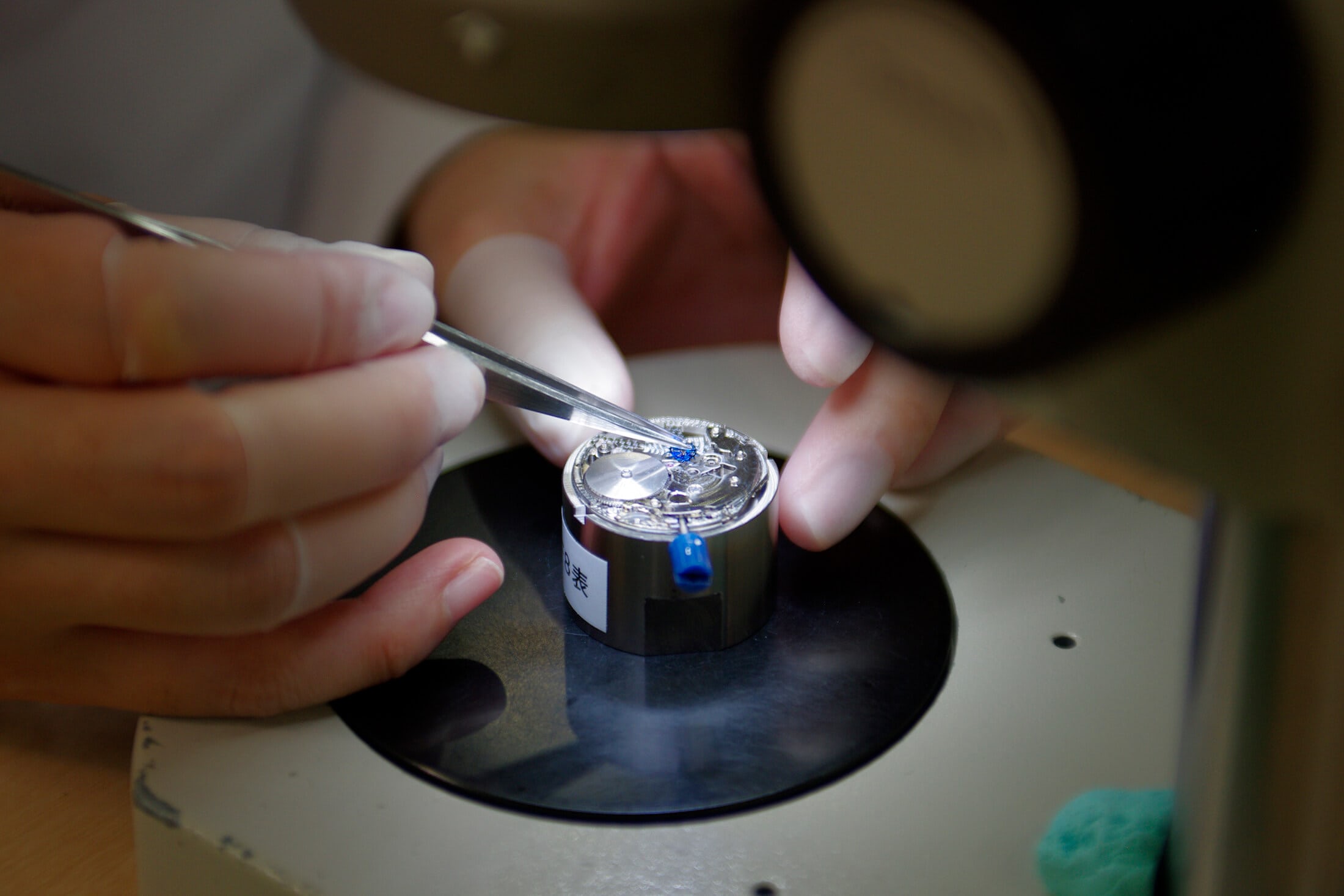 この46系F8の組み立てを担当する秋田エプソンの女性技能者は「シリコン製ガンギ車は金属製よりも傷つきやすいので、柔らかな真ちゅうのピンセットを使っています」と語る。また、シリコン製ガンギ車にカナを固定するための専用の圧入機が、塩尻で開発されたという。