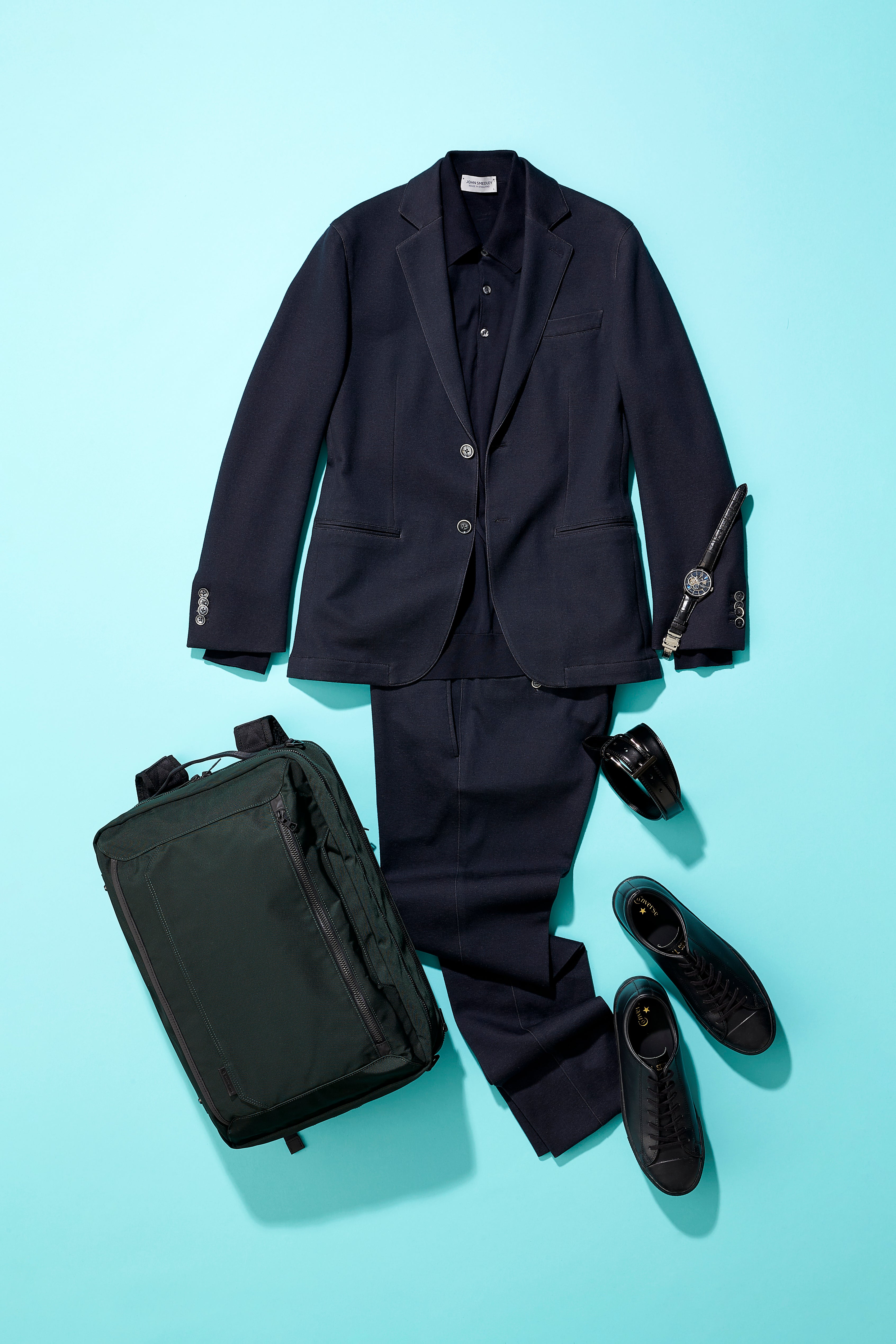 「一つ目は、この数年で増えた自転車通勤の方や、外の現場に行く日、活発に動く日の服装としてお薦めするスタイリングです。まず上下はネイビーのセットアップ。セットアップとは端的に言うと“コンフォタブルな着心地”を備えた上下のこと。ストレッチ素材やウォッシャブルなどの機能性を備えたもの、芯地を省いた仕立てのもの、パンツのウエスト部分にゴムやドローコードが入ったものなどがありますので、ご自身のニーズに合わせて選んでみてください」