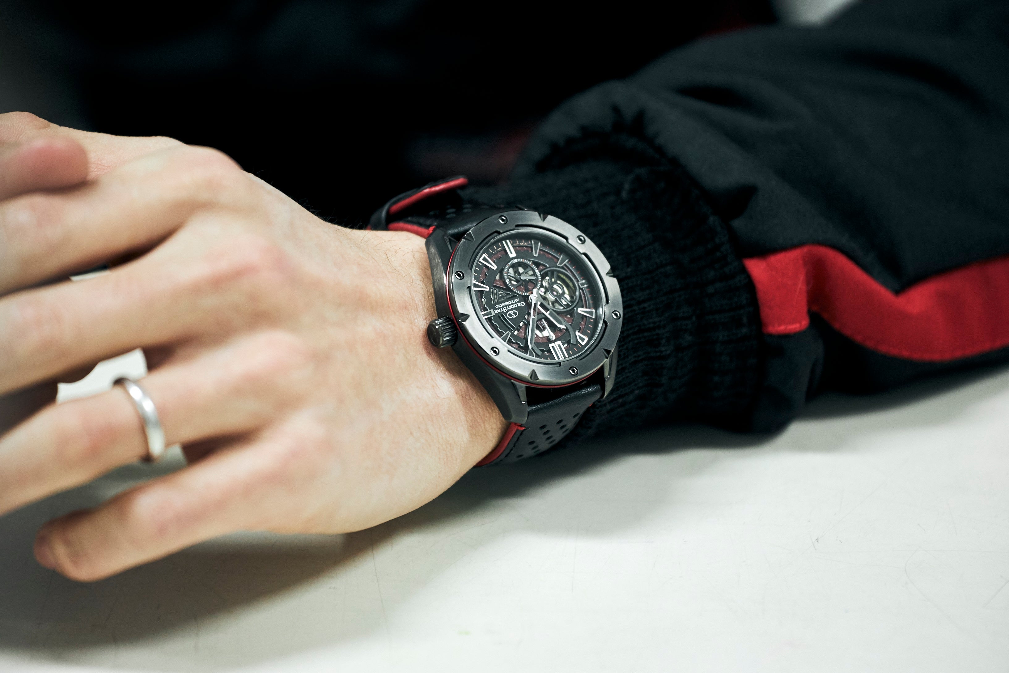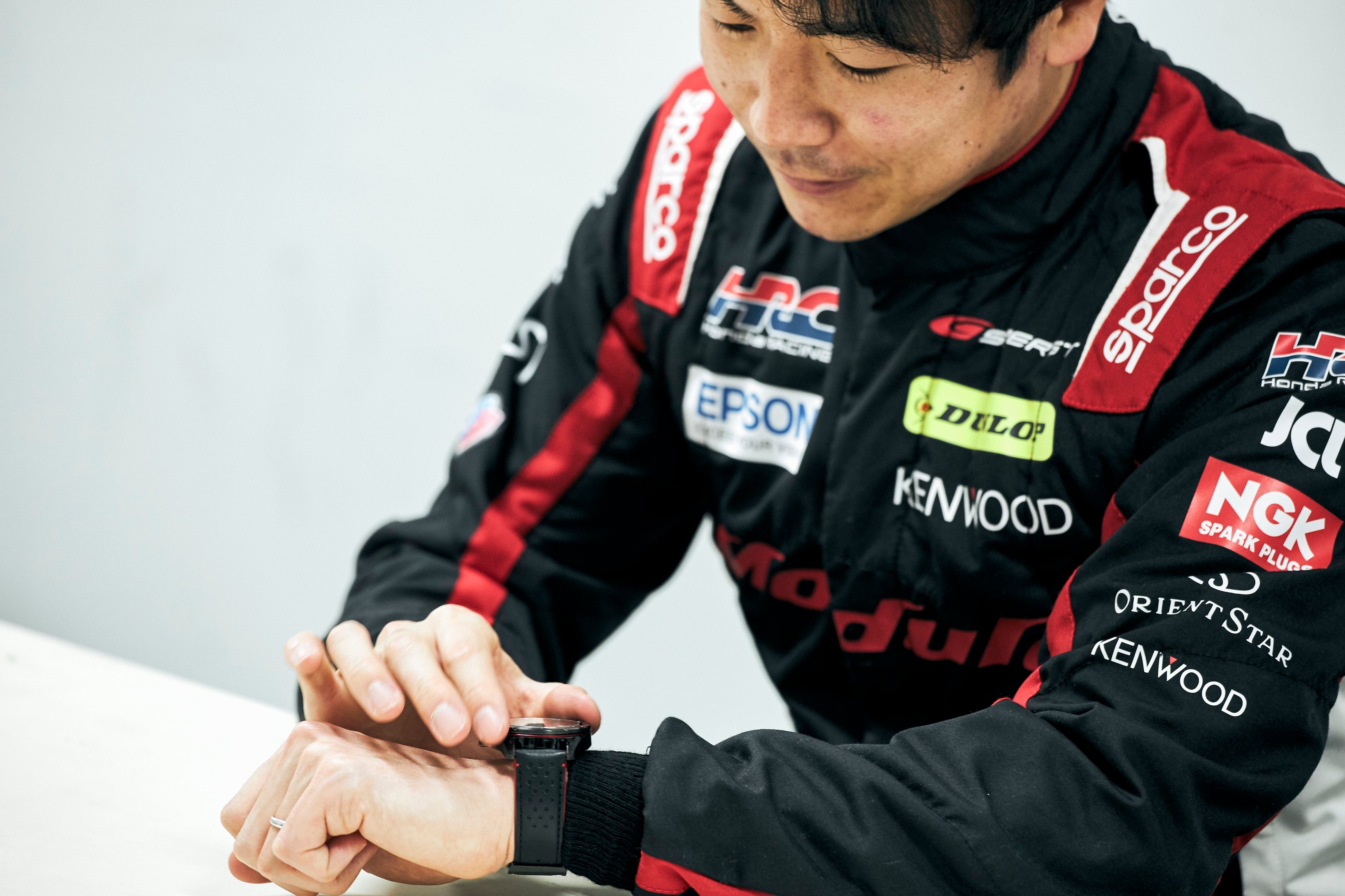 この時計の色合いがスーパーGTで乗る車の色に近かったんです。バンドとかケースの部分の赤と黒が気に入って。時計はそれほど詳しくなかったので見た目で選びました。それに、スーツを着ることがたまにあるのですが、その時にこれを着けたら格好いいんじゃないかなとも思って。実際に着けてみるととてもマッチして格好いいです。奥さんも「いいね」と言ってくれました。
