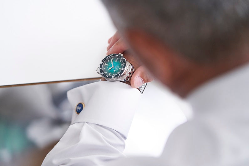 潜水で使っていただいたのはミラーブラックダイヤル仕上げのモデルですが、今回は龍泉洞の神秘的なグリーンを再現したモデルも用意しました。ダイヤルにグリーンのグラデーションを施したこのモデルです。