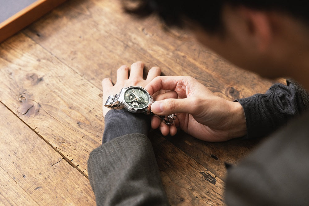 Kinoshita 色を入れるのはとても難しいと思うんですよね。主張はしたいけれど、派手すぎだと引いてしまう。その点、この色のトーンはとても絶妙だと思います。これ以上明るくすると、年齢層が下の若者の時計になってしまいそうですし、これ以上暗いとグリーンにする意味がなくなってしまいますし。