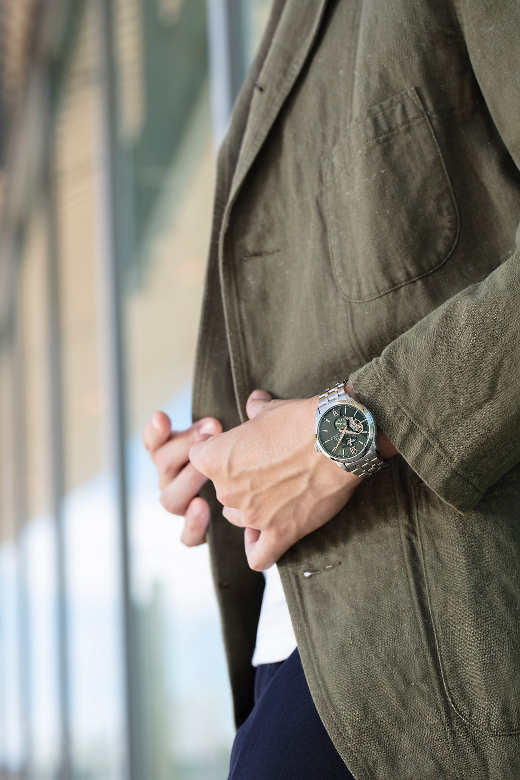 Kinoshita オーダースーツの業界でも、最近はカーキやオリーブの色みで作られる方が多くなって、市民権を得た感じがします。ベースに取り入れられる方もいれば、ネクタイのストライプの1色に取り入れる、シャツのストライプに取り入れるという方も増えていますね。個人的には、この文字板の中でゴールドの色を入れるのが新鮮で。ここにワンポイント入っているだけで、すごくこだわりのある人なのかなと感じますし。無意識に見せるじゃないですけれど、そういった感覚を表現できる時計だなという印象です。