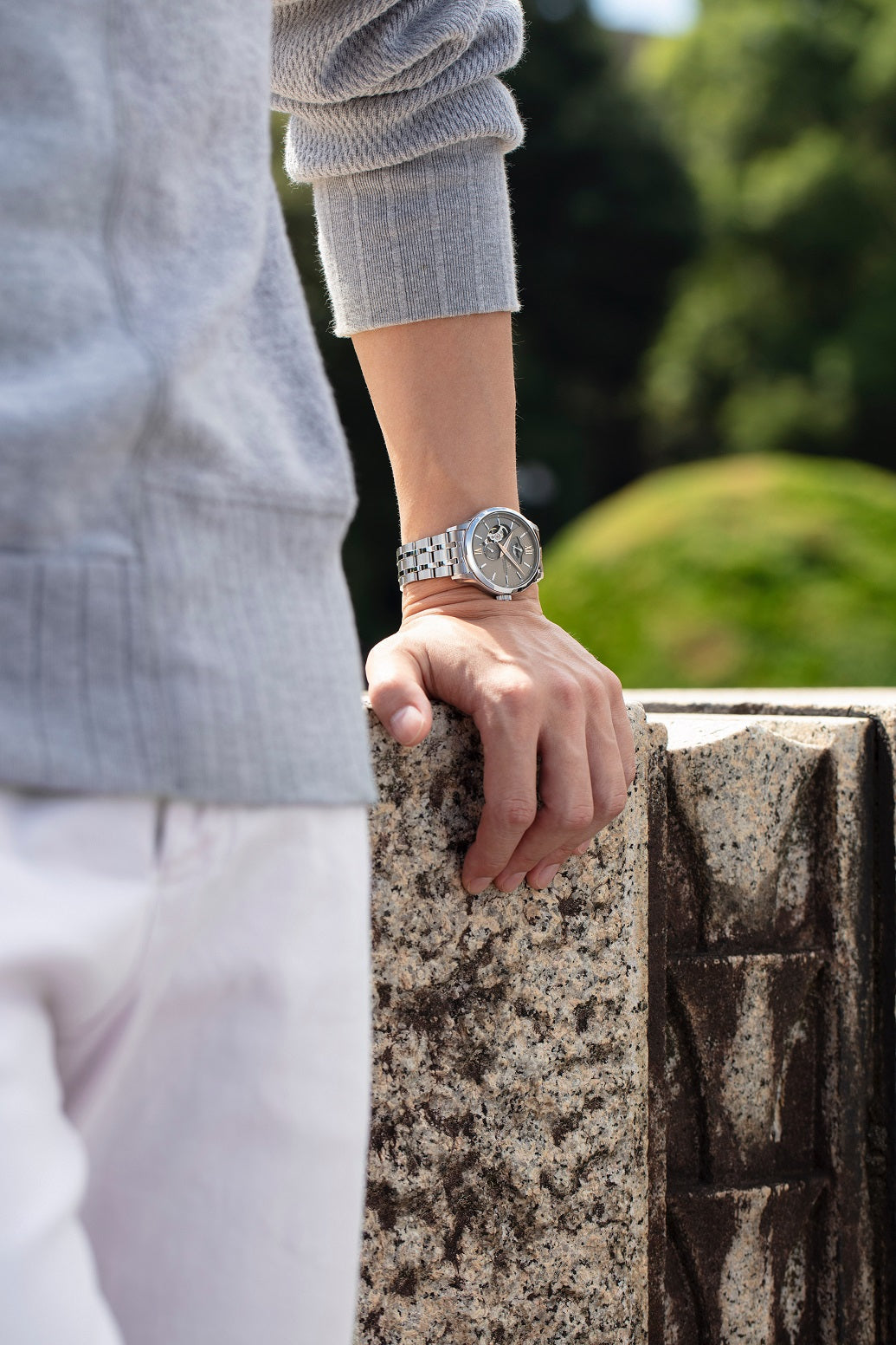 Kinoshita 私は、本当にファッション好きの方が着けたい時計だなと感じました。正直、1本目に買う時計ではないと思っていて、2本目3本目に、自分へのご褒美じゃないですけれど、もうワンランク上にステップアップしたい方が選ぶ時計かなと。この文字板のカラーがとても鮮やかできれいなので、スーチング(注:スーツ素材またはスーツを使ったコーディネート)でしっかり合わせてもいいですし、逆にカジュアルで時計を目立たせることもできるし、足したり引いたりということに長けている汎用性の高いデザインだなと思います。