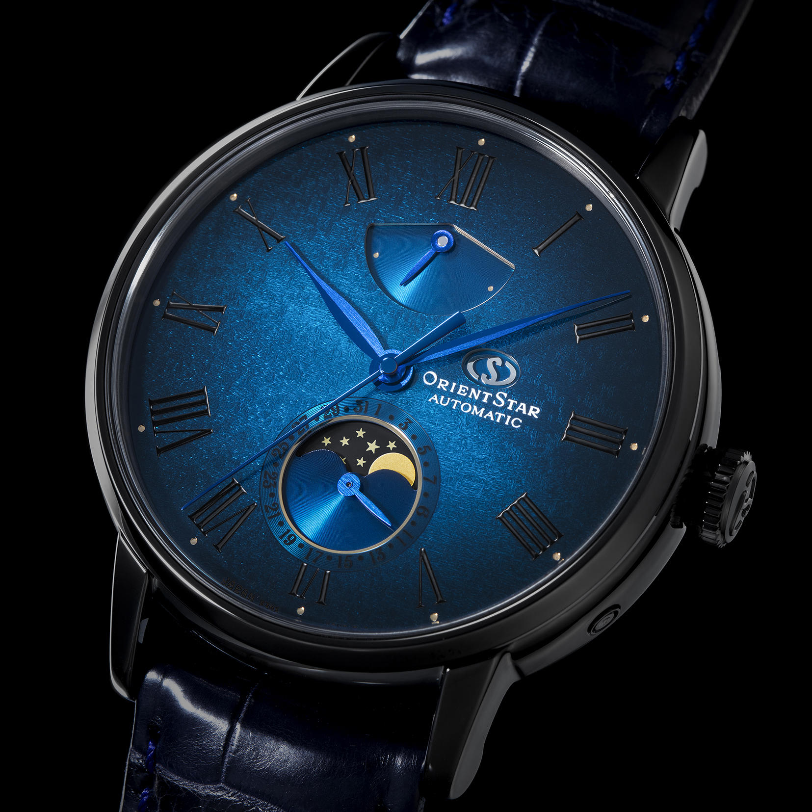 クラシックムーンフェイズ(※)で幕を開けた宇宙をテーマとした時計作りは、その後、文字板の装飾やパーツの仕上げ、各種モチーフなどに着実に広がっていきます。オリエントスターのファンの方でしたら、湖面に月が映る様を白蝶貝の文字板で表現した昨年発表のメカニカルムーンフェイズをご記憶の方も多いことでしょう。