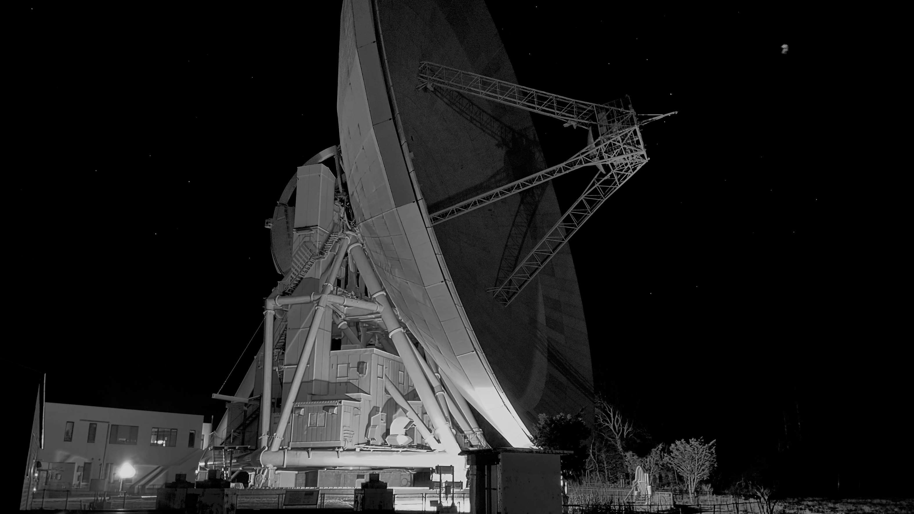 口径45mにも及ぶ電波望遠鏡の巨大なパラボラアンテナは、風や温度差によってわずかではあるが形が変わってしまう。テクノロジーを駆使して、その変形を最小限に抑え、またその歪みを精密に計測し、微調整を行うことで高い精度を保っている。
