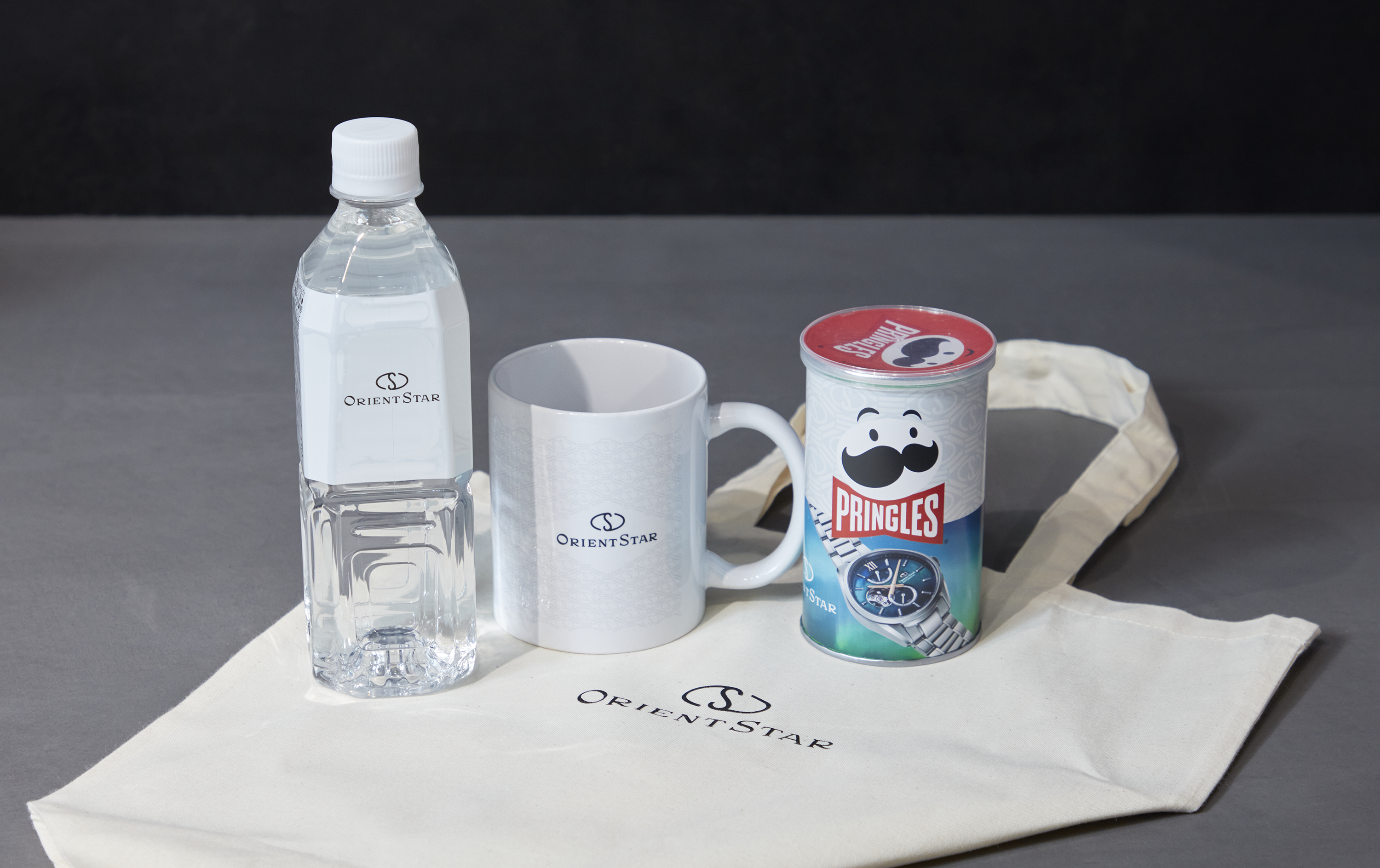 ご来場された皆様には、末永くファンであり続けていただきたいとの思いを込め、オリエントスターのロゴが入ったオリジナルマグカップをはじめ、ロゴ入りミネラルウォーターやポテトチップスなどのノベルティーグッズが贈られました。
