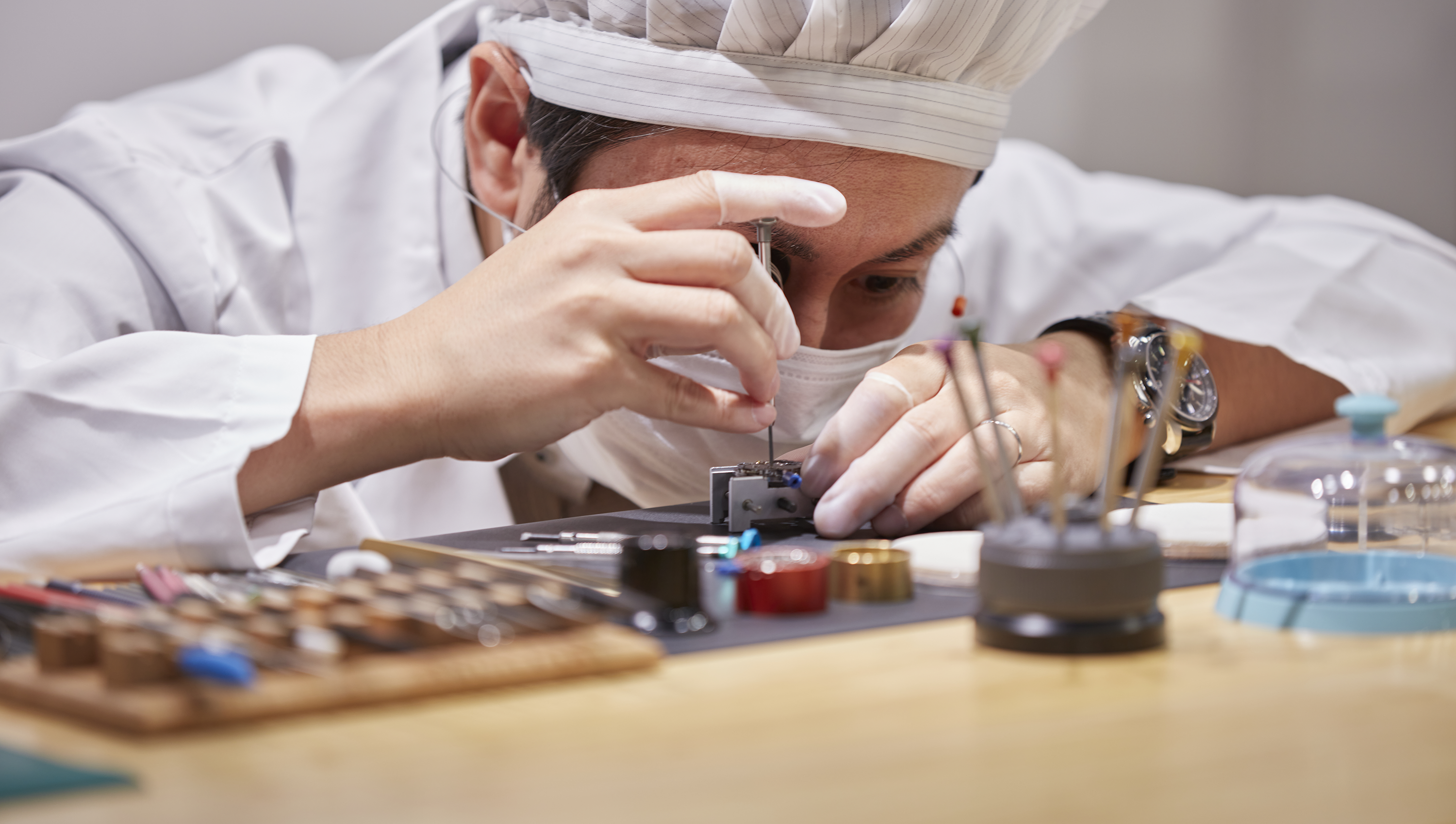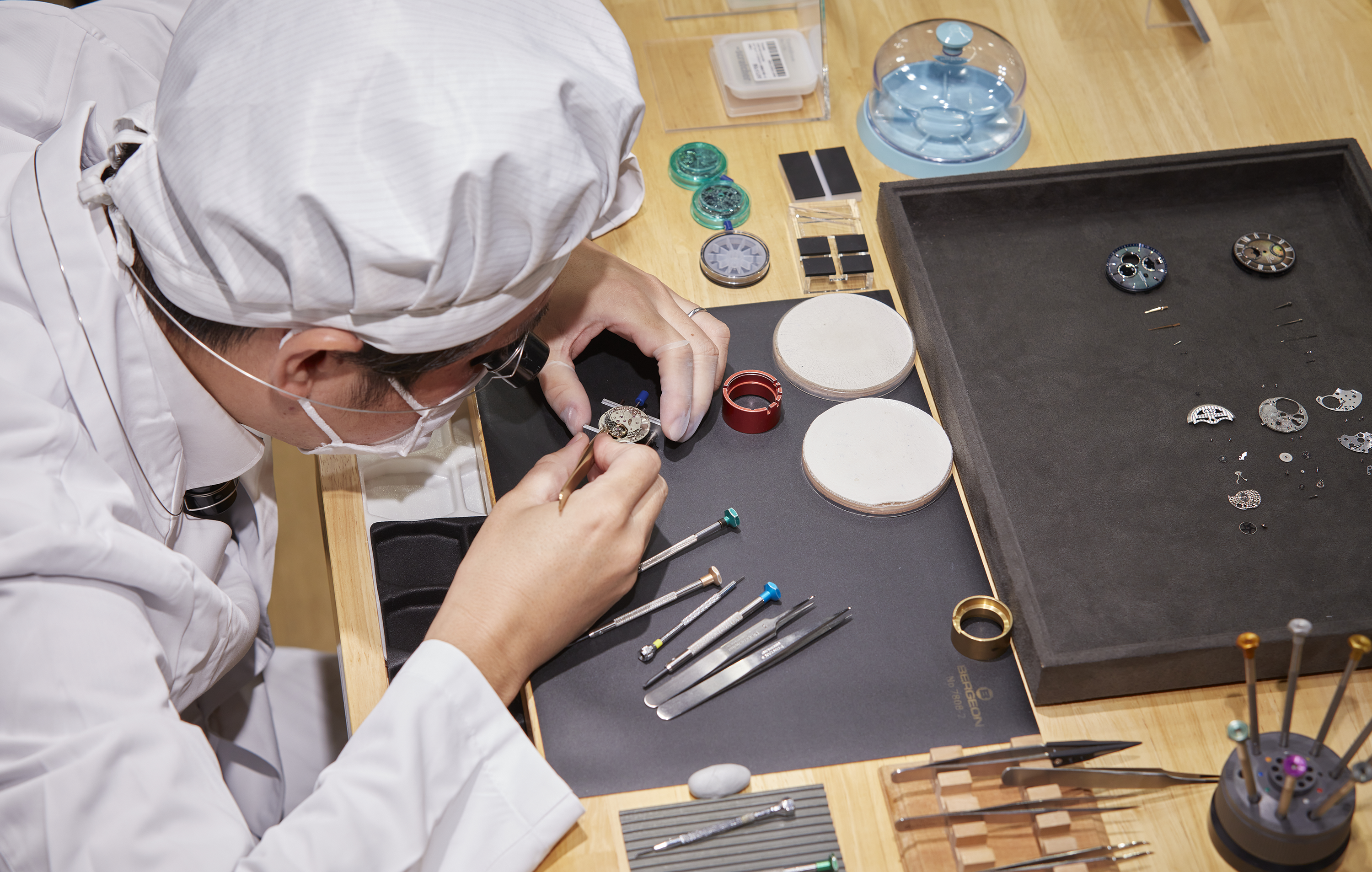ひときわ注目を集めていたのが「分解ショー」。長野県にあるセイコーエプソンの工房から時計技能士が来場し、『M45 F7 メカニカルムーンフェイズ』などの新作を実演で分解していきます。作業台の上には、文字板から微細なネジまで、分解された部品がぎっしりと並び、技能士が手に取る見慣れない工具の数々と相まって、ファンの目をくぎづけにしていました。