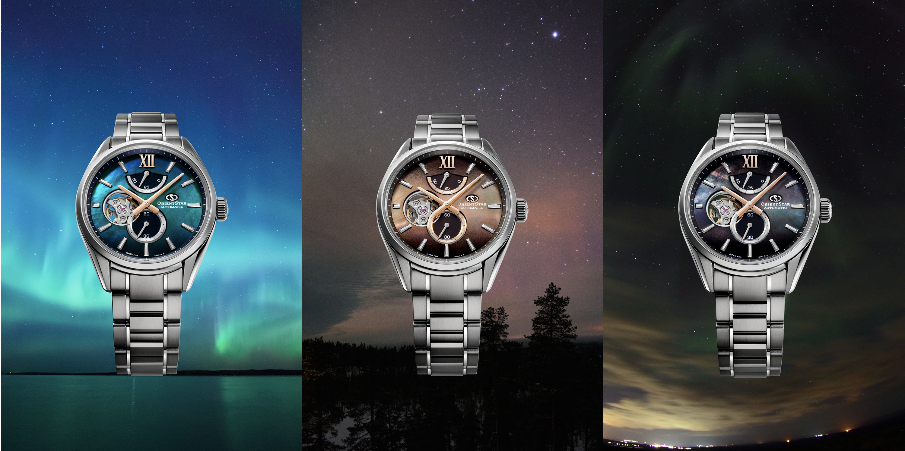 続いて2023年の秋冬の新作紹介が企画担当者より行われました。まずは『M34 F7 セミスケルトン』。この秋のオリエントスターの目玉商品であり、オーロラをテーマに神秘的な色のうつろいをダイヤルで表現するため、素材には見る角度によって表情が変化する白蝶貝を採用。グラデーション塗装によって、夜空に浮かぶ光のカーテンが色鮮やかに描き出されていることが特長だと語りました。