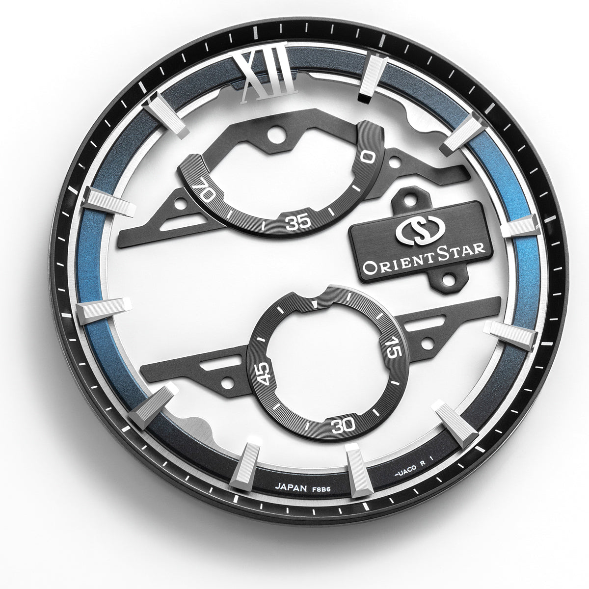 リミテッドモデルでは、グレーで彩られたスケルトンムーブメントは深淵な宇宙空間を表現し、周囲のグレーめっき仕上げのベゼルが深宇宙のイメージを強調し、新たなブルーグラデーションの文字板外周リングが闇の中で輝く恒星の光を彷彿とさせます。