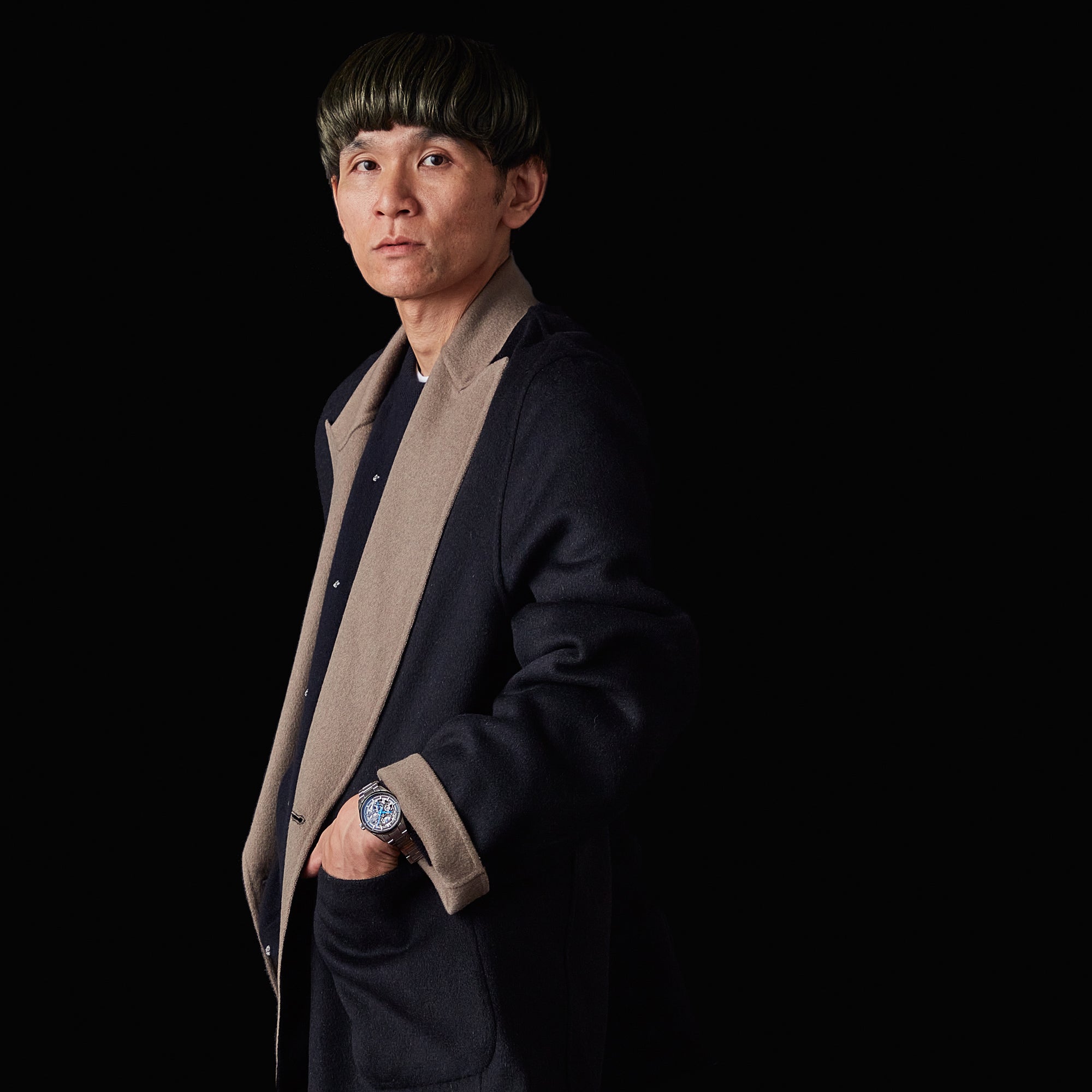 「まずひとつ目のコーディネートですが、お気に入りのウールカシミヤのロングジャケットです。表がネイビー、裏がグレージュのダブルフェイス、ともにニュアンスのある色ですね。こうしたやわらかい素材と表情の洋服に、あえて硬質な腕時計をアクセサリー感覚でつけるのもいいですよね。」「この撮影の前に写真で見ていた印象よりも、スケルトンの文字板から垣間見える機械が輝いていますね。洋服を選ぶ時計かもしれないと思っていましたが、実際に合わせてみると、繊細でエレガントな側面もありますね。針やがんぎ車というパーツの青、この時計の文字板のまわりもブラック~ブルーのグラデーションになっていて、カラーリングも美しい。そのあたりにエレガンスを感じます。」