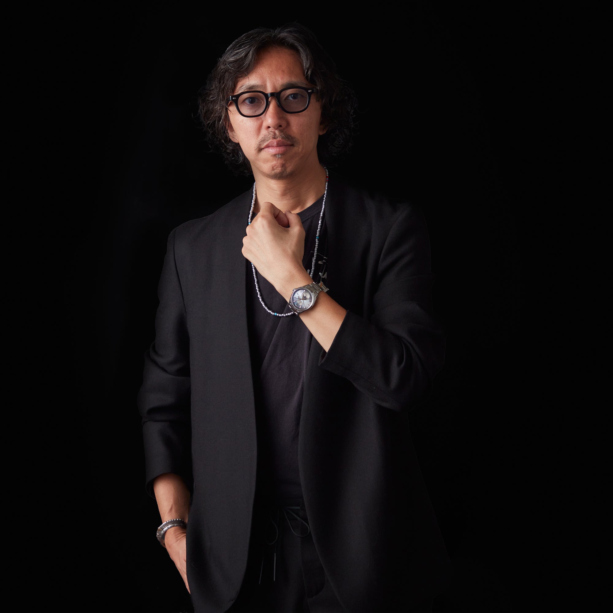 「私服はブラックのアイテムが多いです。このノーカラーのジャケットとパンツも上下ともにブラック。そして、ちょっとドレッシーかつエレガントな中に、腕時計やアクセサリーで遊び心をきかせたい。今回はビーズ系のネックレスを合わせてみました。この時計の魅力はなんといっても、見る角度によってキラキラと輝く、天然の白蝶貝を使用したという文字板の美しさですね」「また、ドレスシャツには貝ボタンを使用したものも多い。さりげなく、文字板とシャツなどのボタンをそろえているのも粋ですよね。洋服の流行はうつろいますが、どんな時代もそうした粋な遊び心は変わらないものです」