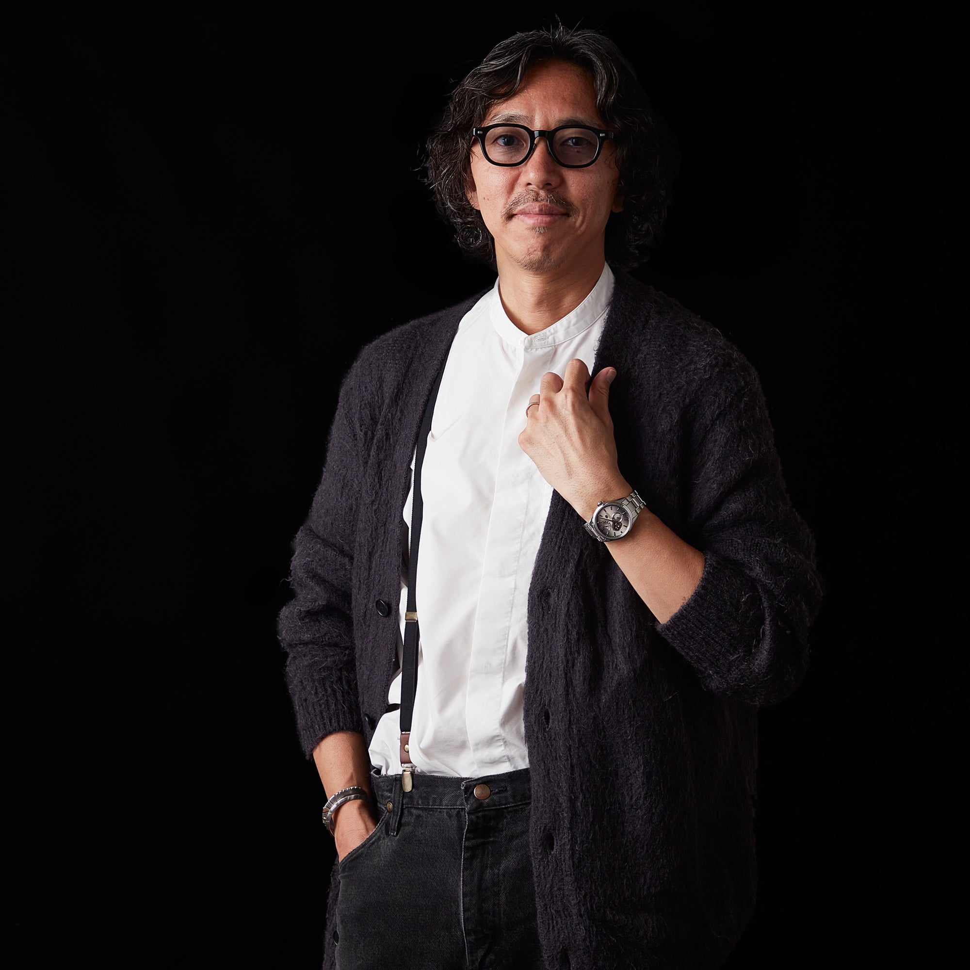 「ふたつめのコーディネート。こちらはカーディガン、デニム・パンツ、そしてサスペンダーやサングラスなどいずれもブラックですが、ニュアンスや素材感が異なるアイテムを合わせています。時計の白蝶貝文字板とともに、ニュアンスカラーを楽しみたい。とくにモヘア(アンゴラヤギの毛を使ったニット素材)のカーディガンのやわらかな雰囲気のなかに、時計の光沢が映えます」普段はオンタイムのスーツ・スタイルをスタイリングすることも多い久保さん。「ビジネスシーンもカジュアル化が進んでいますが、腕時計は男性に許された数少ないアクセサリー。そして、この時計のシンプルなデザインは、基本的に日常のどんなシーンでも使いやすいですよね」とのこと。ムーンフェイズとセミスケルトンという機構をそれぞれ楽しめることはもちろん、貝文字板の美しさは艶のある大人のアクセサリーとしてもオススメなんです。