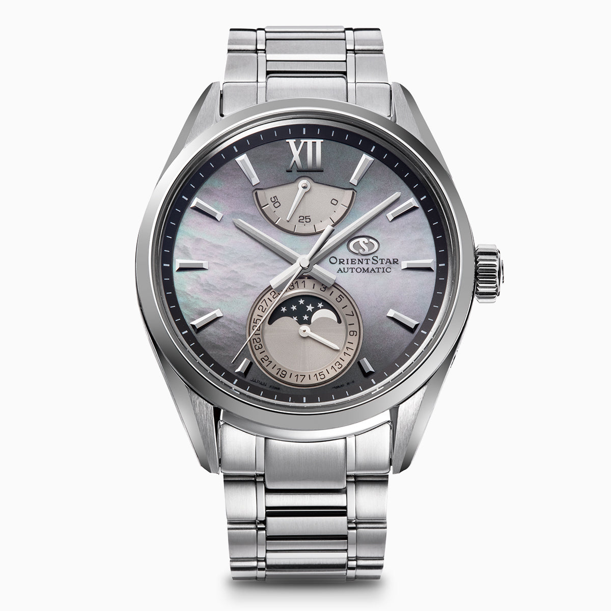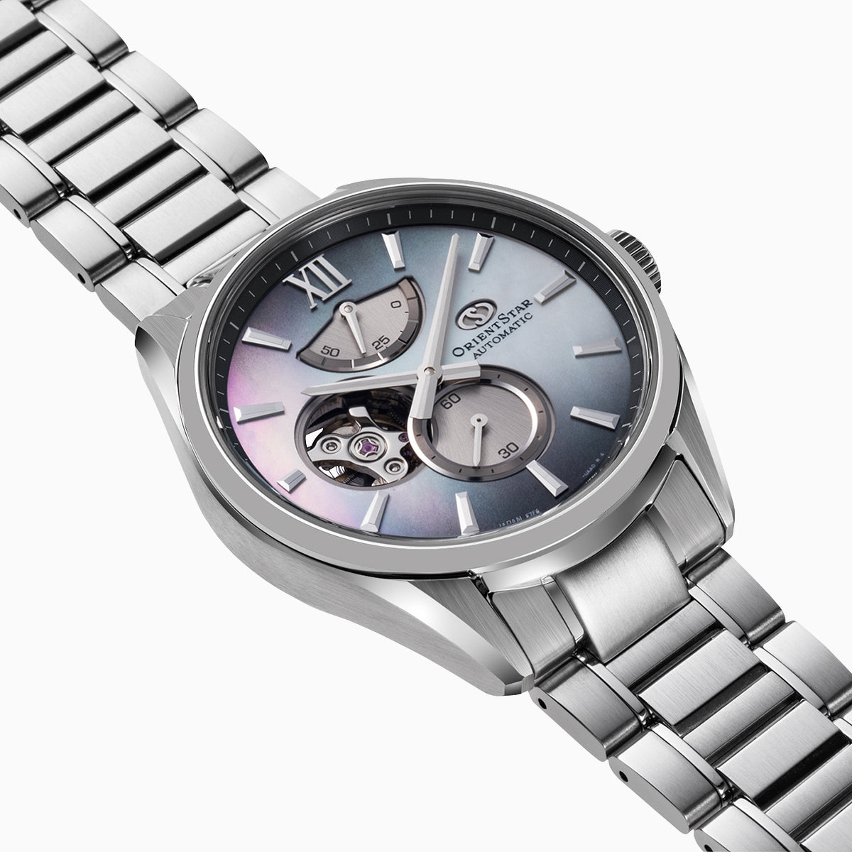 白蝶貝にグラデーション塗装を施し、刻一刻と美しく移ろう情景を表現。濃淡のあるグレーの文字板はセンターから6時および12時方向にグラデーションが施されています。天然素材のために素色や模様がひとつひとつ微妙に色合いが違い、唯一無二の存在感を放ちます。