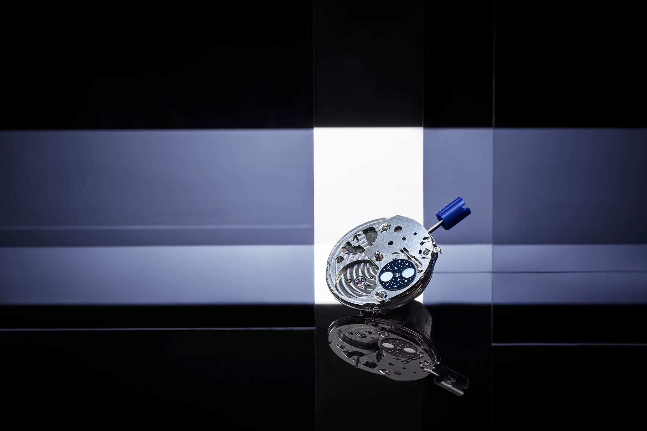 テンプの動きを楽しむ以外に、裏から覗く際に注目すべきポイントは3つある。ひとつは地板に施された波目模様の装飾。これは夜空の星の軌跡をイメージしたもので、波目模様は太いものと細いものが交互に配置されている。ふたつ目は、地板とブリッジのあいだからわずかに覗く青いガンギ車だ。自社開発によるシリコン製で、摩擦抵抗の少ない素材特性ゆえ、結果として70時間以上の駆動を可能にした。手巻きムーブメントはリューズを巻き上げるという行為も楽しみのひとつだが、駆動時間を伸ばすロングパワーリザーブは、リューズの負担や巻き上げ頻度を減らし、パーツの寿命に余裕をもたらすことにも繋がる。3つ目は最も遊び心に満ちたディテールで、輪列の一部が見えるよう、三日月型の切り欠きが地板に施されている。単なる手巻きムーブメントではなく、メカニカルムーンフェイズ専用ムーブメントであることをさりげなく主張するためのデザインである。