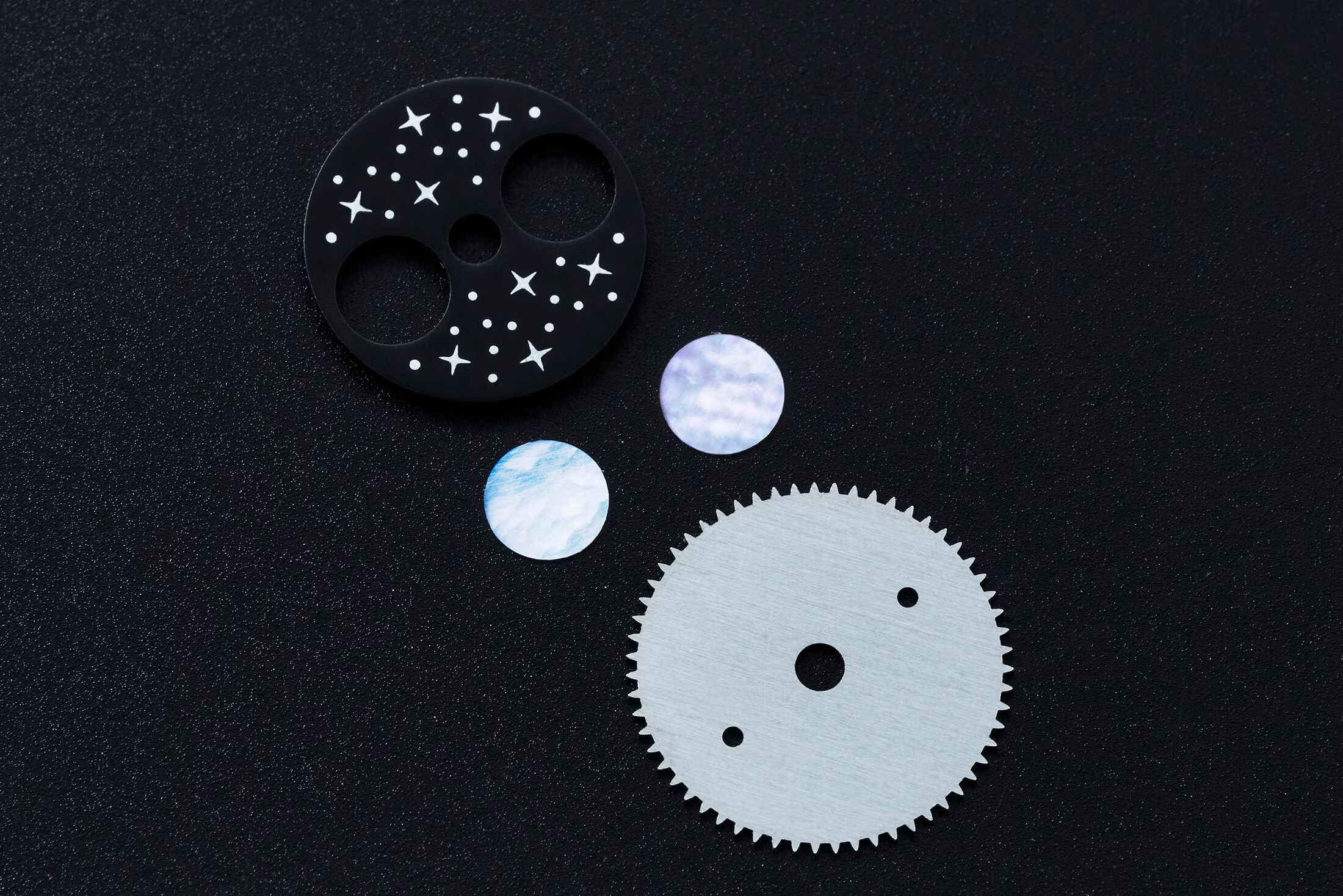 Cal.F8A62に採用されている特許出願中の新型月齢車。月齢車、月を表現した白蝶貝、そして艶のある仕上げに星を散りばめた金属板をトップに重ねる別体の3層構造とすることで精緻な月を表現した。