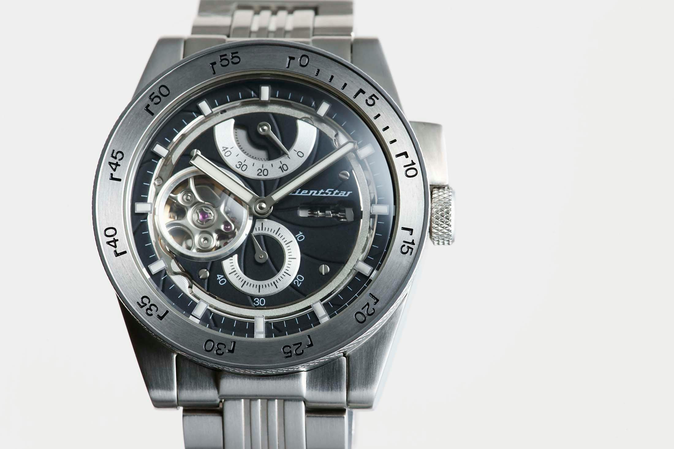 これはペルセウス座流星群をテーマとするデザインで、既存モデルとは趣を大きく変えるツートンの外装が特徴的だ。SUS316Lの高品位なステンレススティールケース(裏蓋含む)とブレスレットにはブラックメッキが施され、一方でベゼルやリューズは明るいシルバーカラー(SS色)とすることで強いコントラストを放つ。さらにダイヤルは、12時位置のみをローマ数字とするインデックスを配したリング状のスケルトンダイヤルと、シボ塗装によるブラックグレーグラデーション仕上げのフレームを組み合わせ、宇宙空間の闇の中にぽっかりとムーブメントが浮かび上がるような仕上がりを目指した。ムーブメントをミニマルに、しかし最大限に引き立てる試みである。