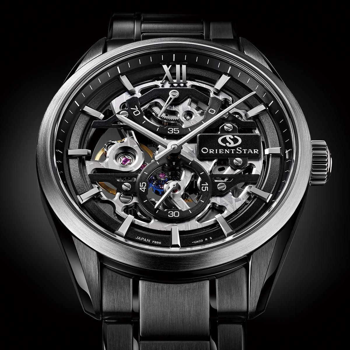 オリエントスター75周年を記念し、今回Mコレクションズから登場した3作は、そうした天体表現の現在地を示すものだ。そのうち、ブランドの真骨頂であるスケルトンデザインに宇宙のロマンを込めたのが「M34 F8 スケルトン 75th アニバーサリー」である。目玉は隕石の断面を表現した地板とブリッジ。これには精細なレーザー加工が施され、1000兆分の1秒の極めて短いパルス幅でレーザーを照射し、隕石の結晶構造をリアルに再現。黒基調の中、ベゼルにステンレススティールの地の色を残すことで、宇宙船の窓から深遠な宇宙をのぞくかのような、奥行き感のあるスケルトンを表現した。