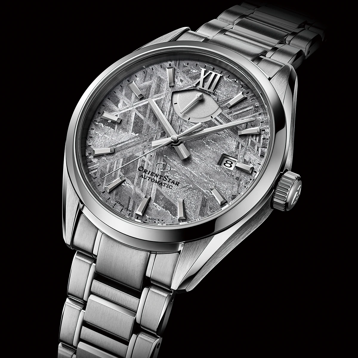 また、シンプルな外観ながら、明確に異質な文字盤に仕上げたモデルが「M34 F8 デイト 75th アニバーサリー」だ。こちらはオリエントスターで初めて実物の隕石を文字盤に採用した。用いられる隕石は、ウィドマンシュテッテン構造と呼ばれる、結晶模様が特徴的なもので、それをスライスして使うため当然ながら、模様はすべて異なる。自分だけの特別な腕時計を求める人には絶好のモデルと言えるだろう。