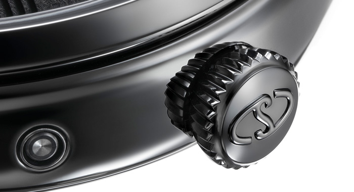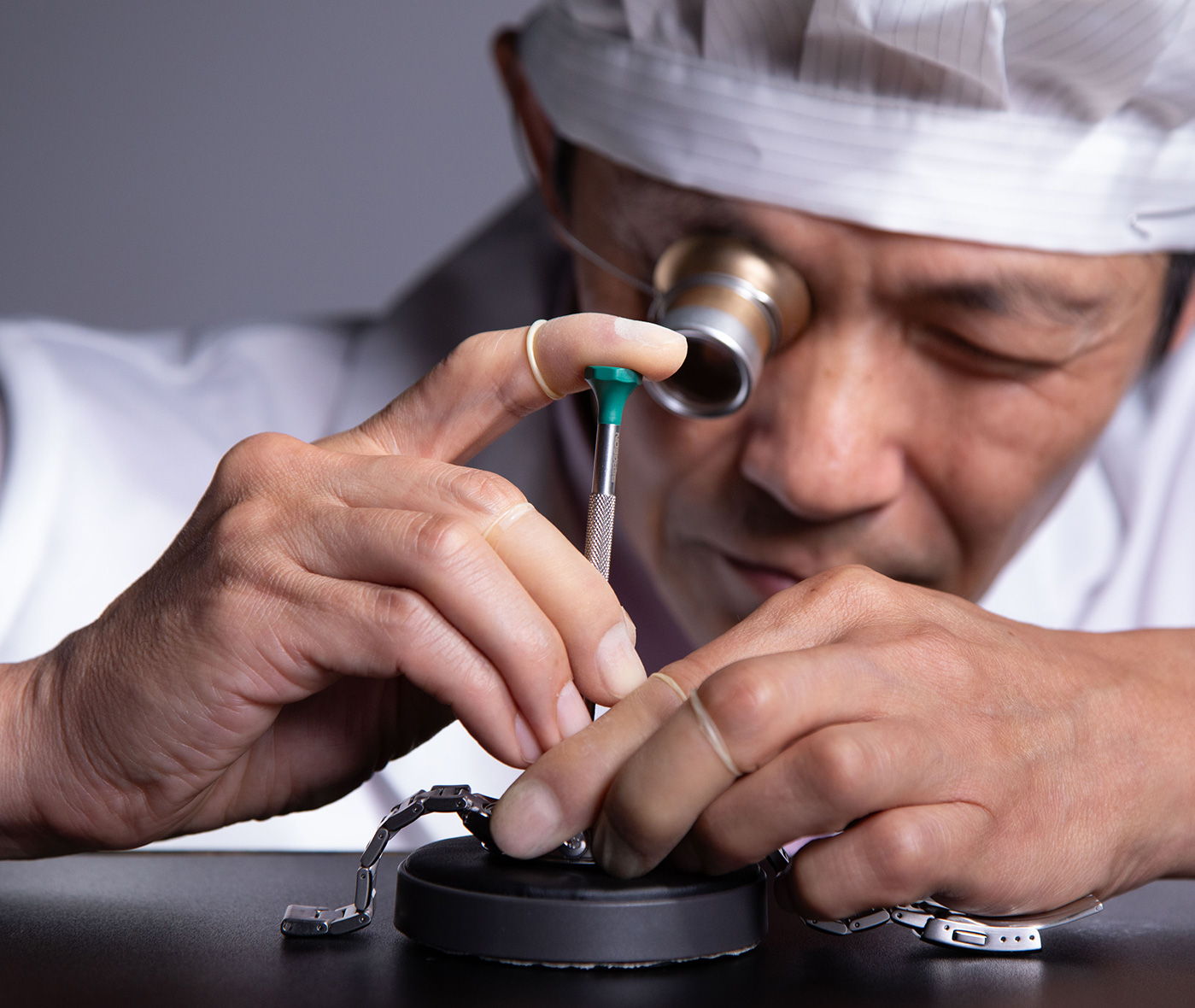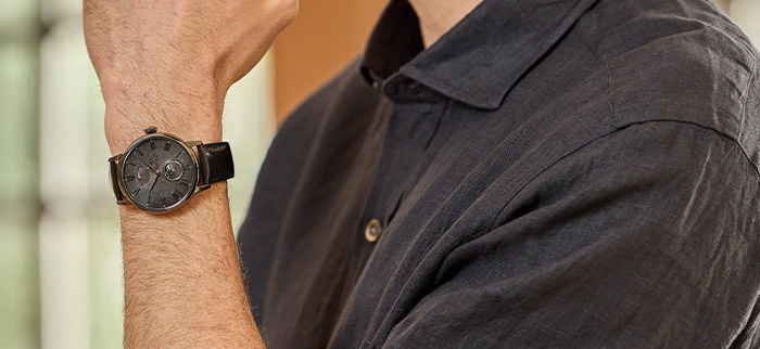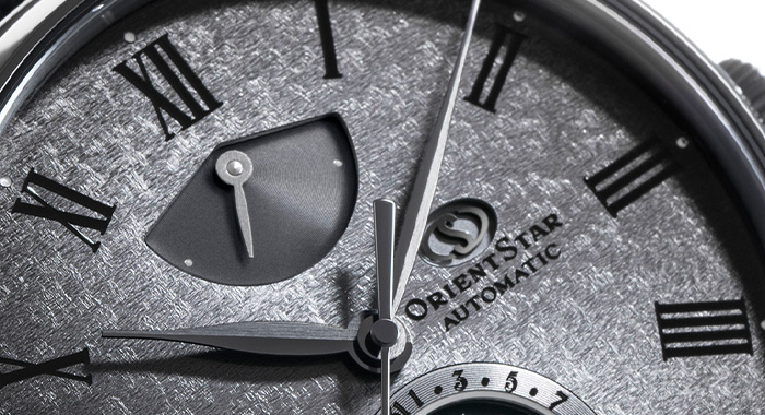 ・蒸着めっきでブラックに仕上げられた時針と分針は、鏡面と筋目の仕上げ分けを丁寧に施すことで、視認性を維持しています。