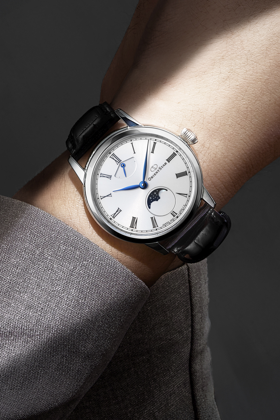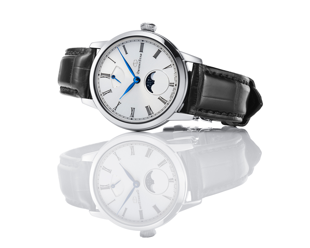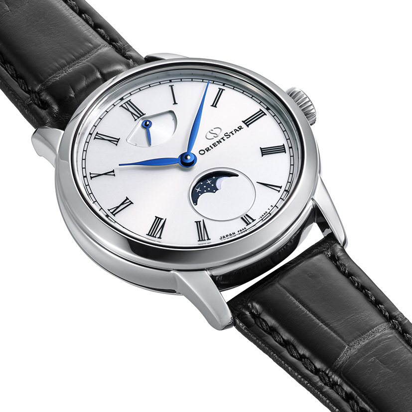 ホワイト文字板のレギュラーモデルが描き出すのは「夜の静寂に月がひとつ」ある情景。きめ細かな放射目仕上げに厚クリア塗装(ラッピング加工)を加えた文字板は、艶やかで優美な質感にブルーのリーフ針が映え、上質なクラシシズムを演出。