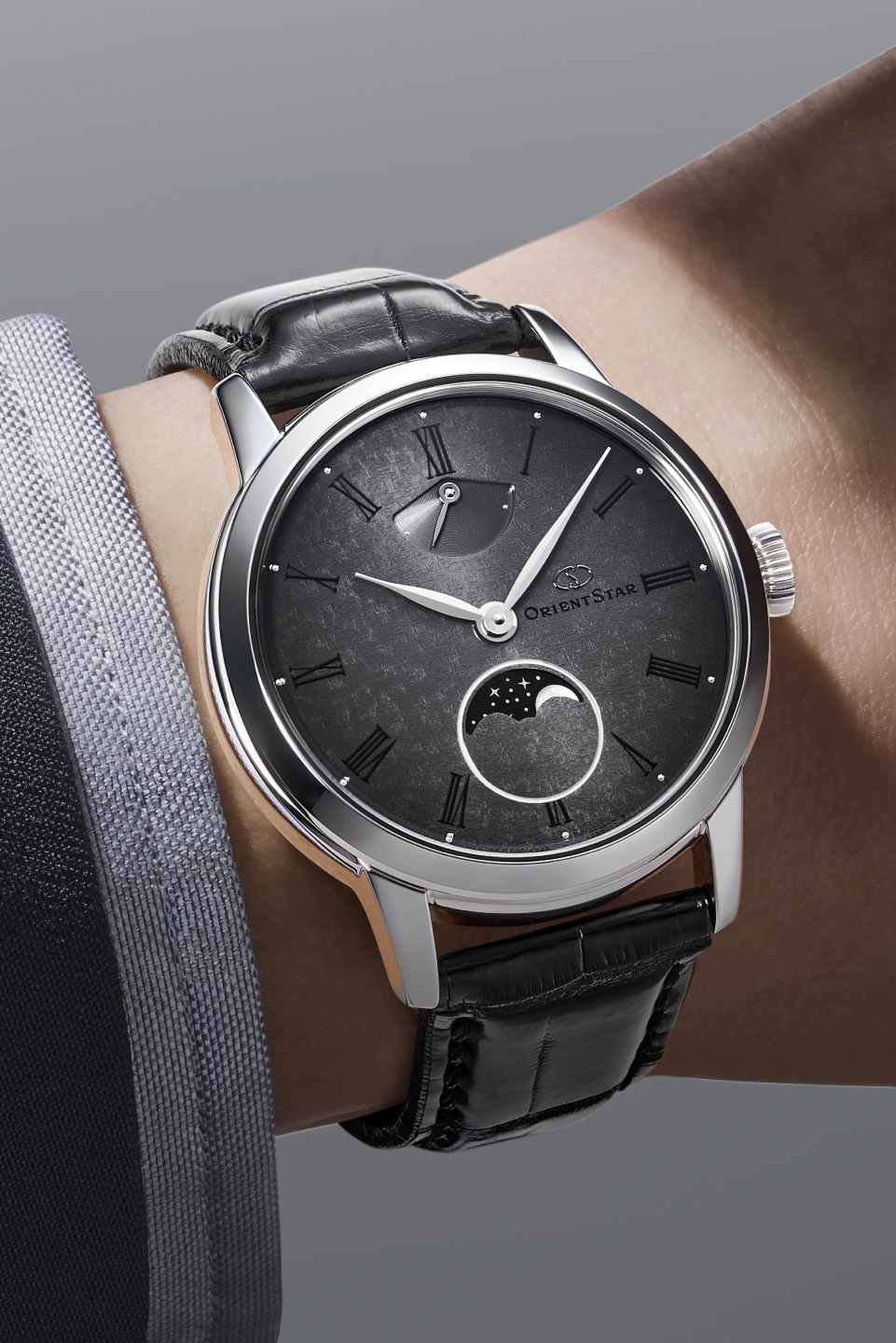 グレーグラデーション文字板の数量限定モデルが描き出すのは、暗闇に光る神秘的な星団すばる(プレアデス)と月が織りなす美しい情景。「M45(すばる)」を成す無数の星々を型打ち模様で文字板に施し、独自に調合された塗料を文字板中心のグレーから外周に向かってブラックへと変化するモノトーンな階調を生み出しました。