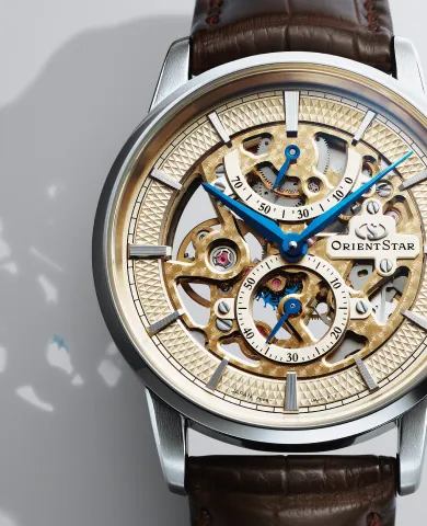 精緻なスケルトン設計によって機構が露わになったムーブメントが、