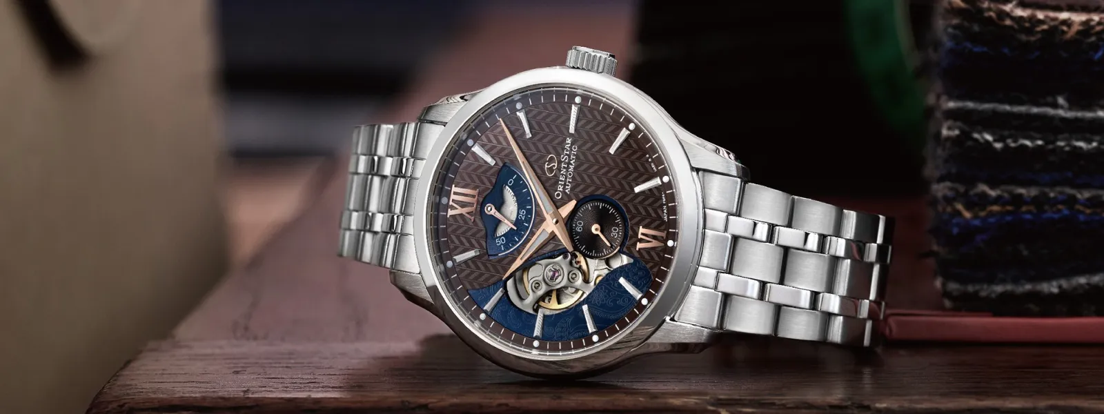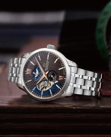 テキスタイルをモチーフにした2枚仕立ての文字板と、