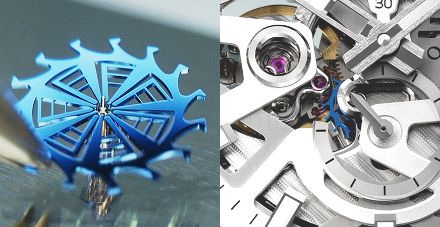 デザインから製造まで一貫して自社開発したシリコン製がんぎ車は、MEMS加工技術と半導体成膜技術を応用しています。